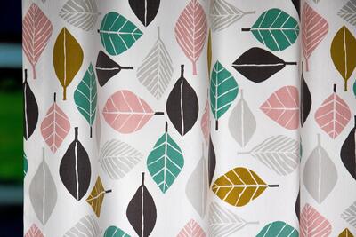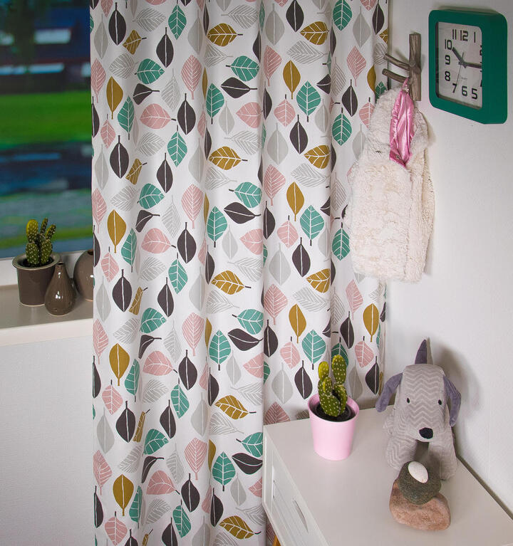 Fraaie gestileerde bladeren dwarrelen zachtjes naar beneden op dit gordijn. Ze zijn in zachte tinten gedrukt op de matte katoenen stof. De ondergrondkleur is warmwit en de vlotte weefstructuur zichtbaar. De blaadjes zijn +/- 10 cm groot en door het rustig repeterende patroon geschikt voor iedere (slaap)kamer. Het gordijn is leverbaar in 6 verschillende kleurpaletten, waardoor jouw favoriete combinatie er zeker bij zit. Om de kleurechte nuances te zien, adviseren wij om een knipstaal van de stof te bestellen. Waarschijnlijk ben je verrast hoe decoratief een ‘blaadjes-gordijn’ kan zijn!