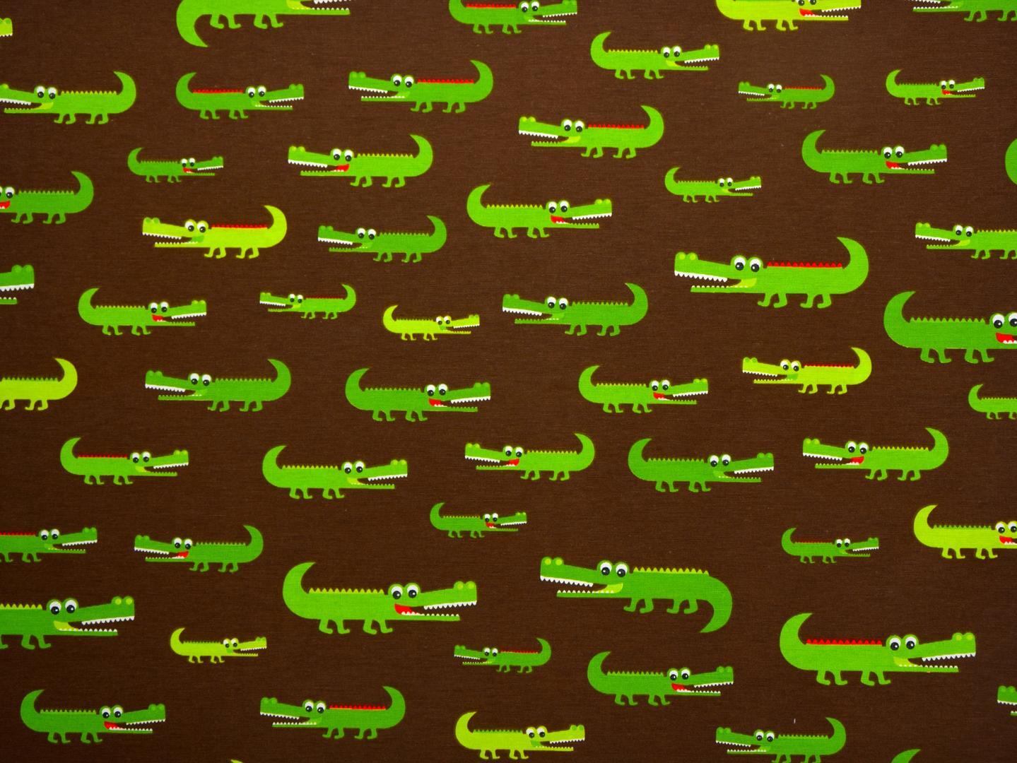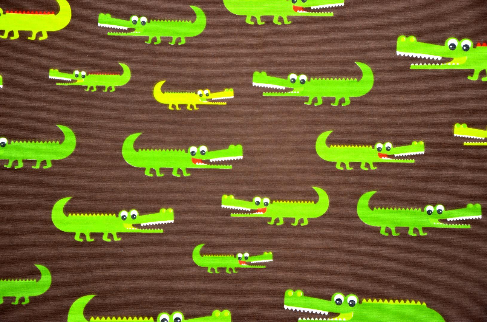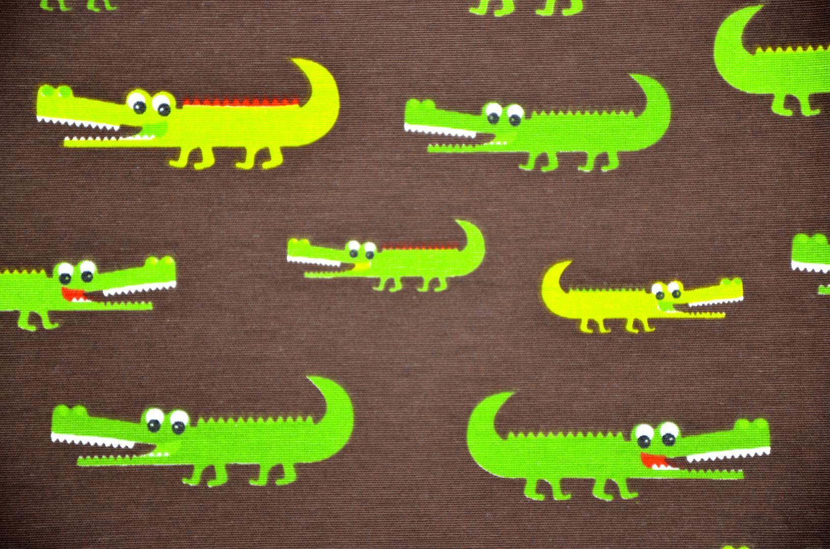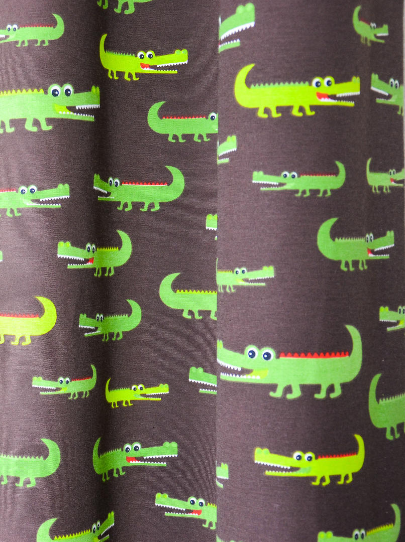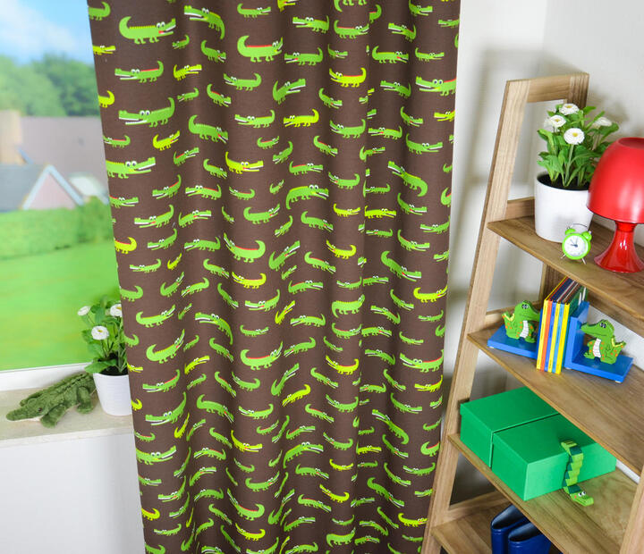 Krrrrr .okodil! Een krokodil heeft iets magisch. Spannend, vervaarlijk en indrukwekkend om te zien. Op dit gordijn met een lachende rij parelwitte tanden. Croco is 10 cm groot en gedrukt op diep donkerbruine, matte stof. Het contrast met de olijfgroene krokodillen geeft een speels effect. Geen wonder dat er verschillende leuke kinderboeken over dit dier geschreven zijn, Croco spreekt tot de verbeelding! Voor verduistering desgewenst voeren.