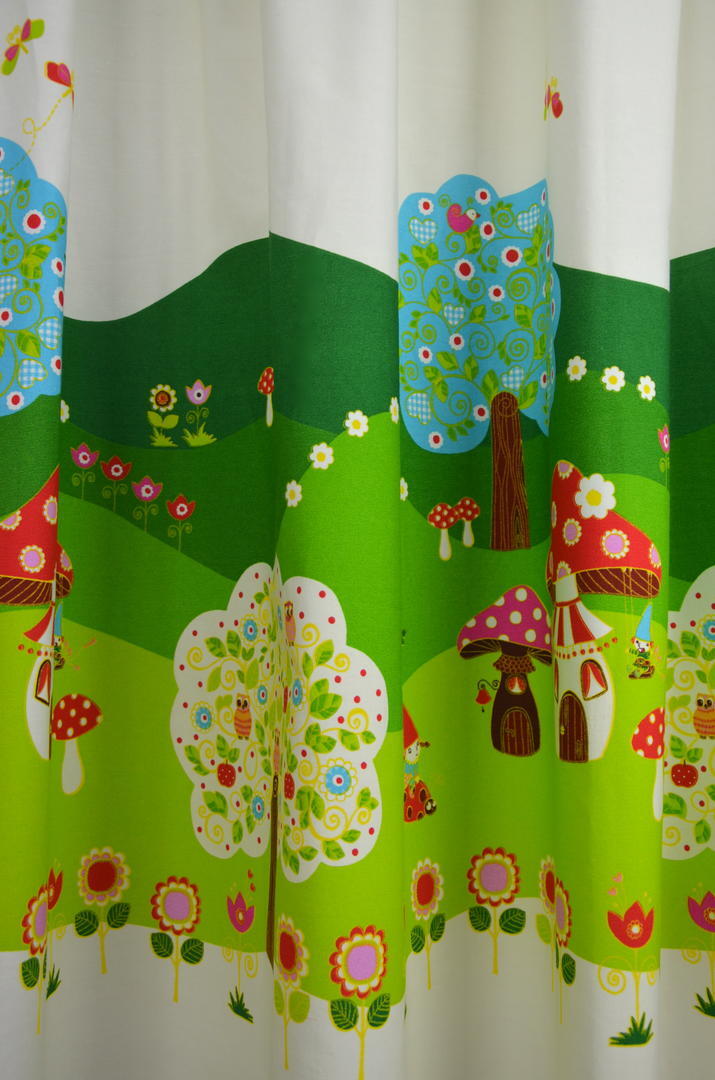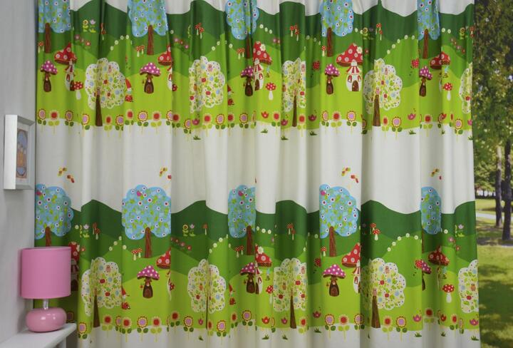 Een gordijn uit de sprookjeswereld, héérlijk toch?! Kinderstof vol fantasie en kleur! De paddenstoel met witte stippen, bloemen en kabouters zijn gedrukt op soepelvallende, glad geweven katoen. Leverbaar in 2 kleurstellingen. Het patroon is heel royaal, waardoor het gordijn uitstekend tot de grond gemaakt kan worden. De boom is zelfs 35 cm groot! Maak jij van je slaapkamer een echt sprookjesbos? Voor een extra donkermakend effect even laten voeren.