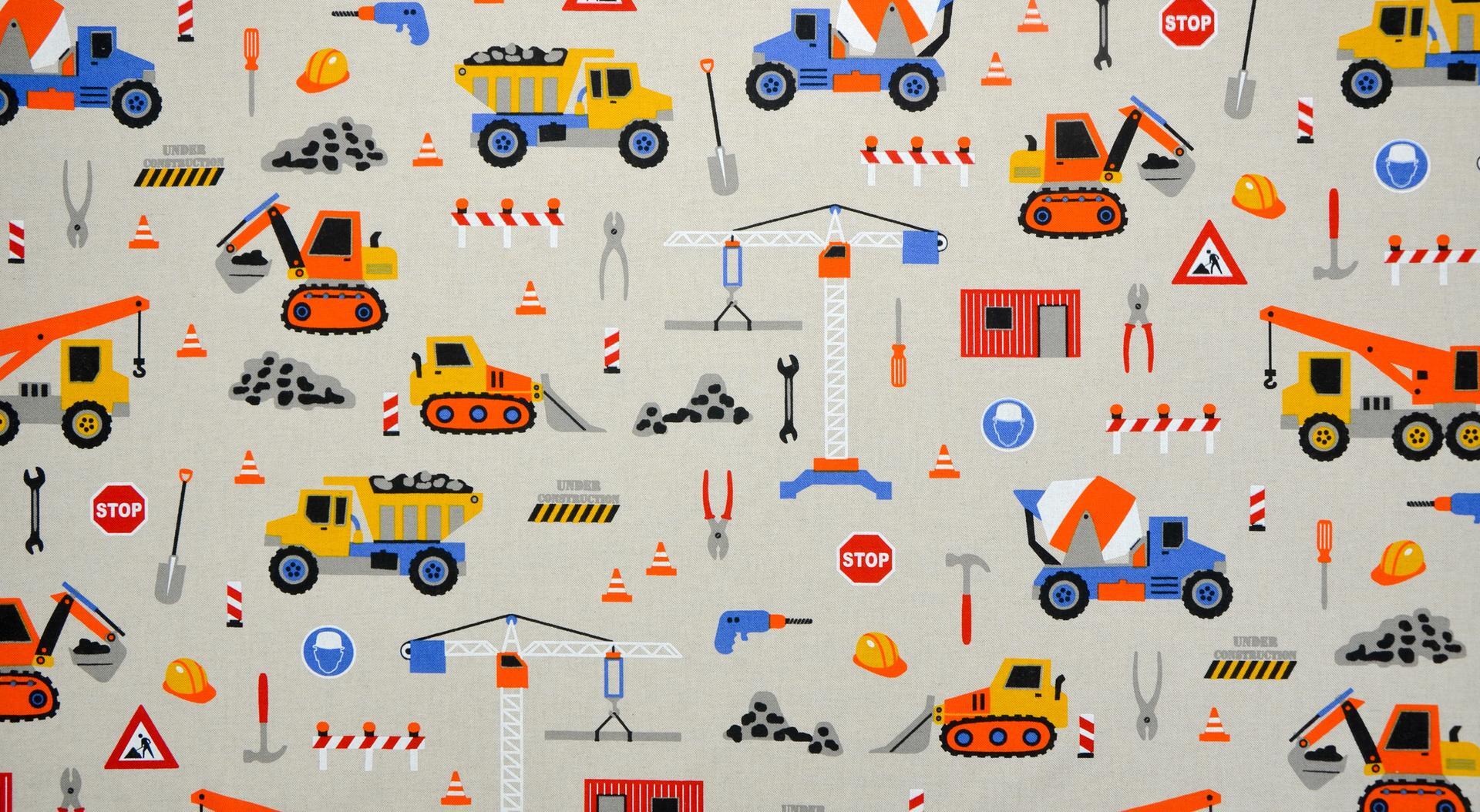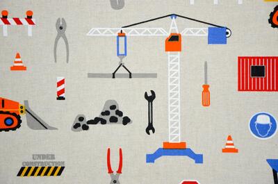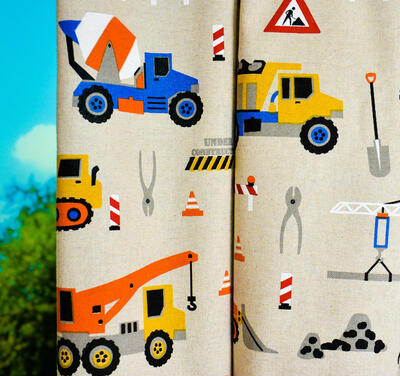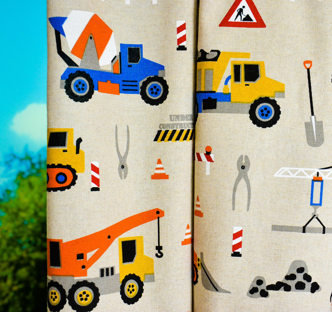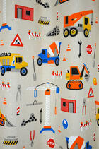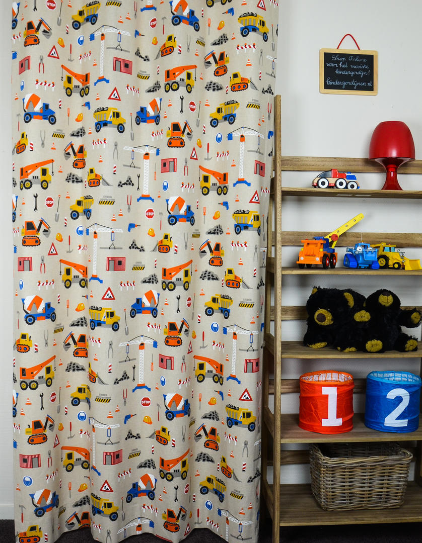 Werk aan de weg! Van kiepwagen, graafmachine tot veiligheidshelm; het staat allemaal afgebeeld op dit stoere jongensgordijn. Je kan zo vanuit je eigen bed een fantasie verhaal bedenken! Wat gaat er vandaag gebeuren op de bouwplaats? Is het ruw terrein of misschien zelfs een kiezelgroeve? De vrachtwagens zijn zo’n 14 x 8 cm groot en gedrukt op diep donkerblauwe sportieve stof. De vrolijke kleuraccenten geel, oranje, rood zijn leuk om verder te gebruiken in de slaapkamer. Voor kleurbehoud van de terreinwagens én het gordijn, even laten voeren. Dan is het óók direct prettig donker.