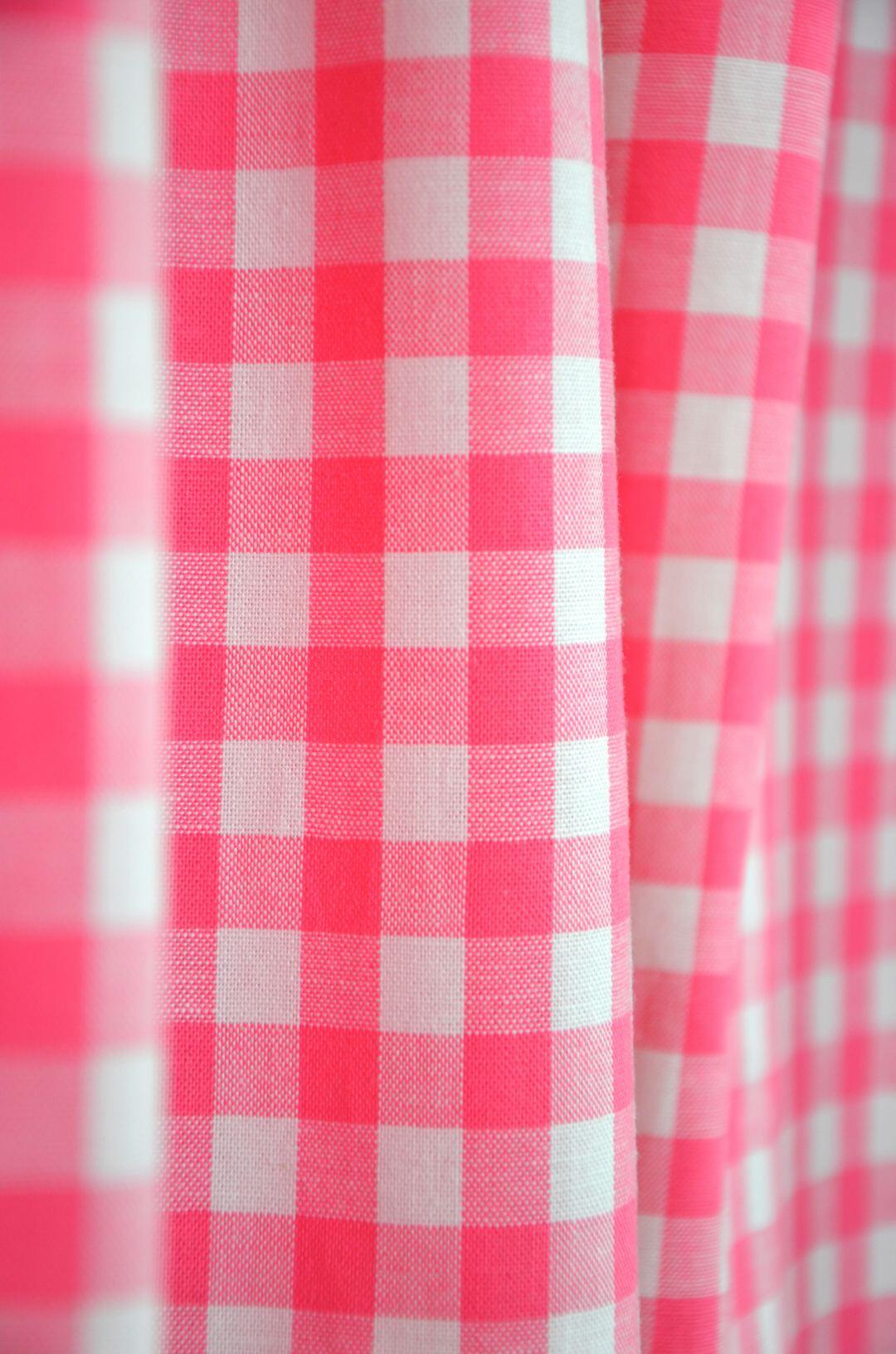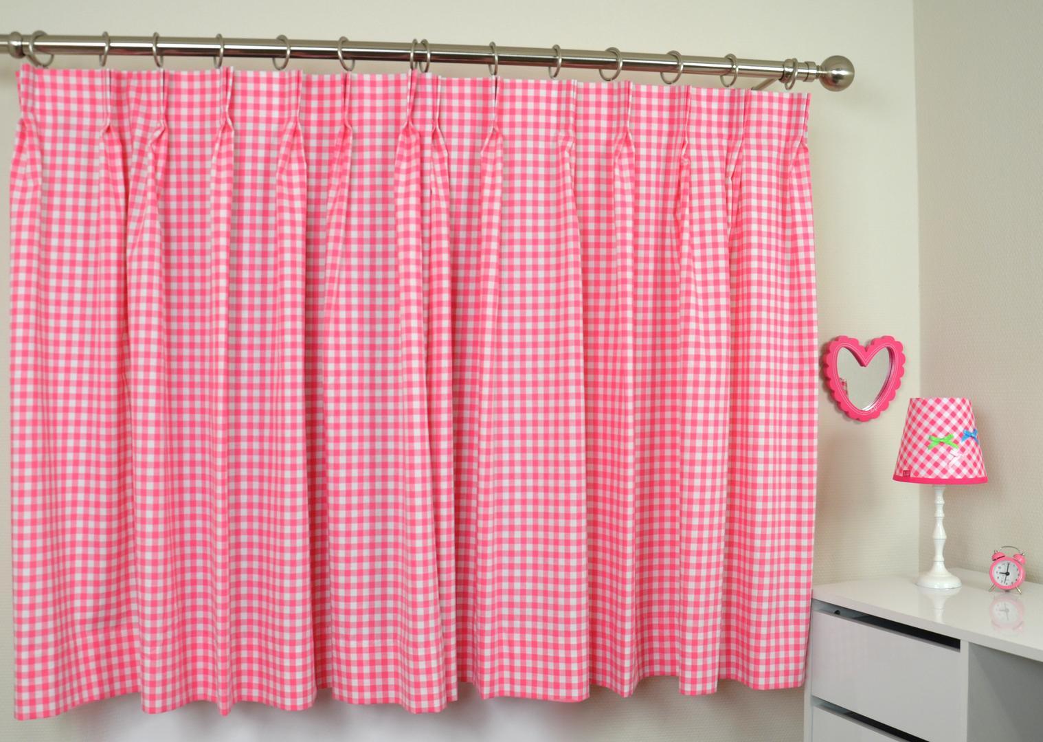 Dit overgordijn met neutraal ruitmotief is leverbaar in veertien verschillende kleuren. De ruit is ongeveer 1,5 centimeter.