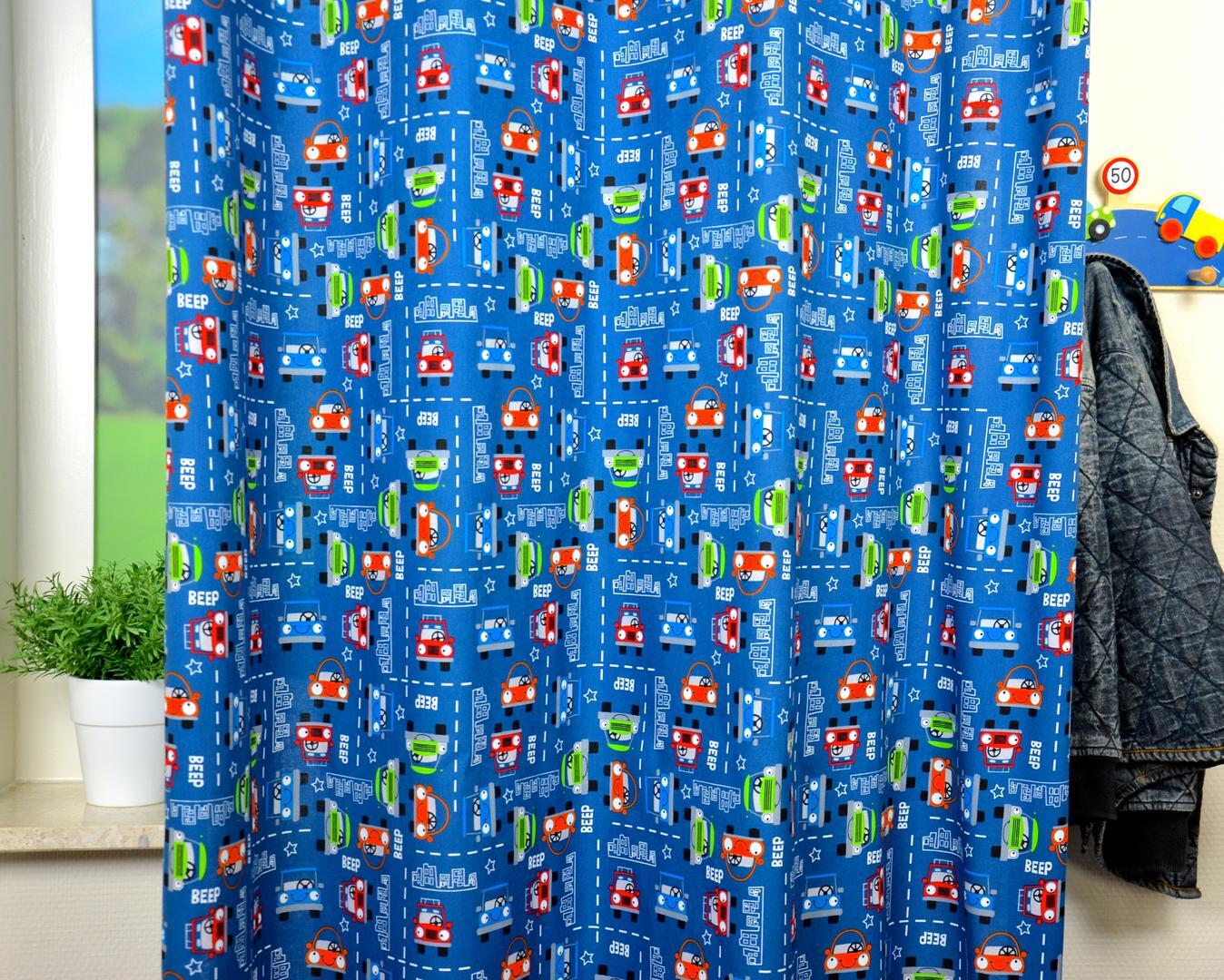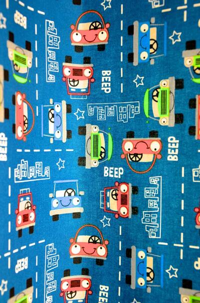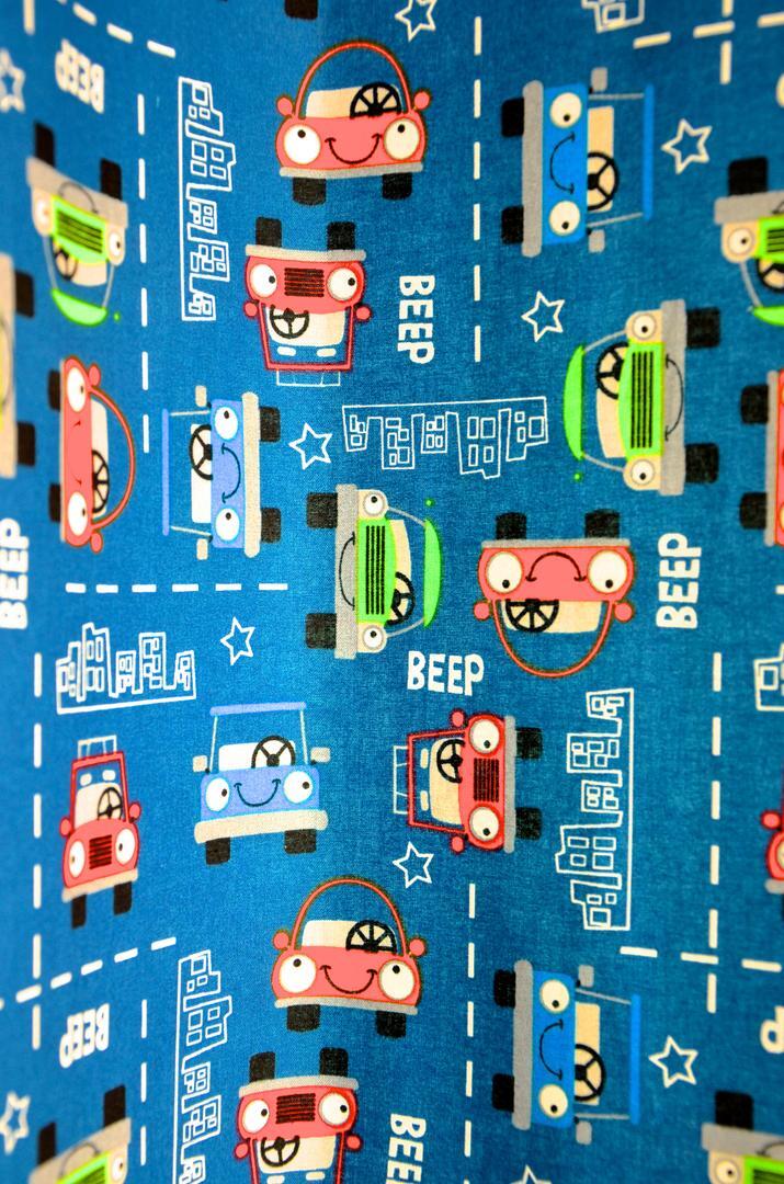 Vrolijke jongens gordijnen ‘Beep in the city’. De autootjes zijn 4 cm groot en vrij strak grafisch verdeeld over de lichtdoorlatende stof. Dat geeft een rustig effect. De ondergrondkleur is donkerblauw. Autootje Beep heeft grappige koplampoogjes, die lachend je kamer inkijken. “Beep – Beep, mag ik een rondje door jou huis rijden?” Om het auto thema compleet te maken zijn er ook kussentjes te bestellen van dezelfde stof
