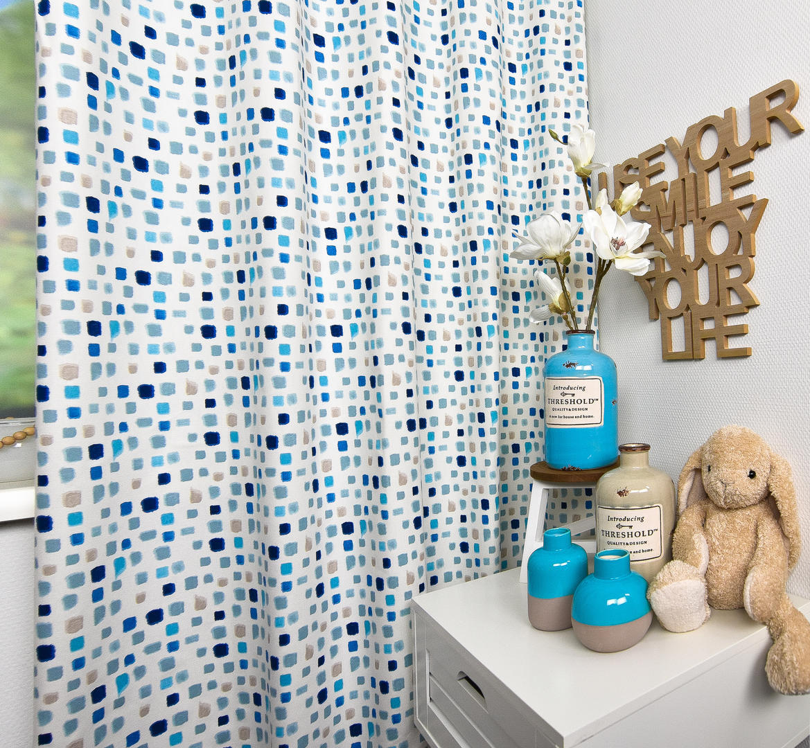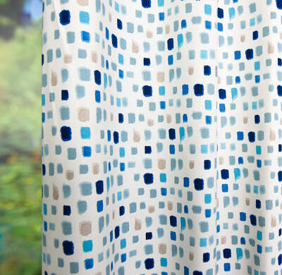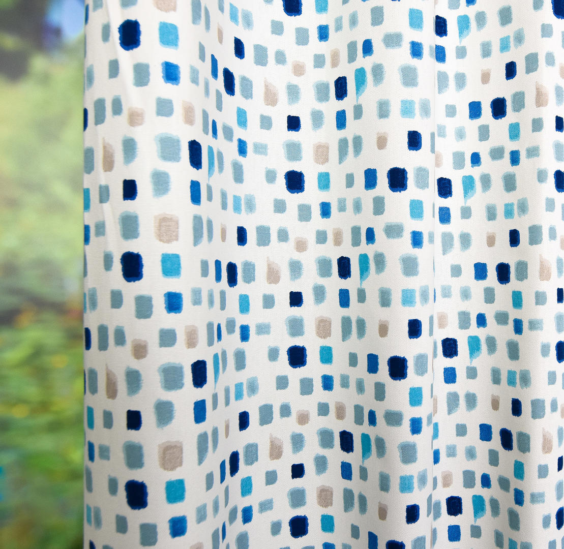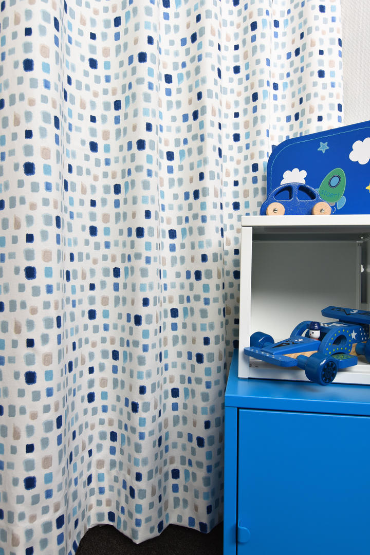 Een gordijn welke geschikt is voor zowel de jongens- als meisjeskamer. De kleuropbouw is n.l. van donkerblauw, naar jeans, aqua en subtiel warm grijs. Je kan bij een meidenkamer heel leuk een wand aqua blauw maken of misschien de wat neutralere kiezelgrijze tint. Voor de jongens is het vergrijsde blauw leuk of durf je zelfs de diep donkerblauwe kleur? Jeanslook behang kan óók super zijn! Kortom, met dit gordijn kan je alle kanten op. Tijdloos en makkelijk te combineren. De stof is mat en heeft een sportieve, ietwat geruwde structuur. We hebben deze stof voorradig, dus vlotte levering is gegarandeerd!