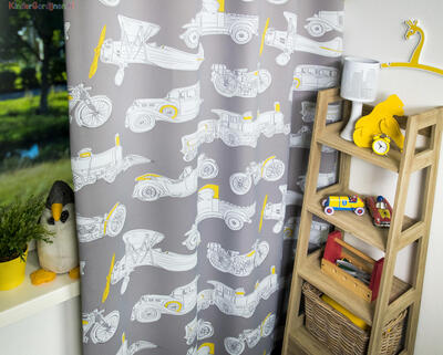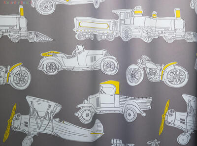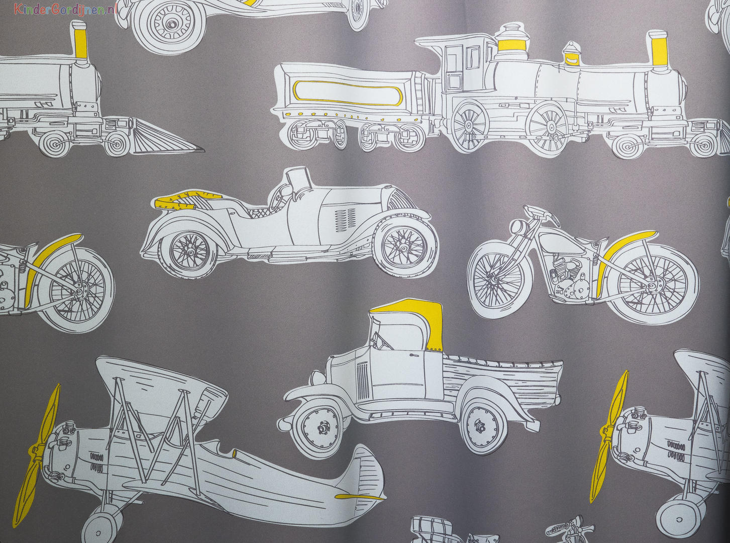 Voertuigen uit vervlogen tijden, maar o zo tijdloos én stijlvol! Een oldtimer gordijn dat is leuk voor jong én oud! De stof is leverbaar in 2 kleuren: taupe grijs met geel als contrastkleur en fris zilvergrijs, met blauw als accentkleur. De print is op de voorzijde gedrukt op dim out stof, d.w.z. gordijnstof welke zonder extra voering de slaapkamer al aangenaam donker maakt. De afbeeldingen zijn zo’n 25 cm breed en gedrukt op gladde, soepelvallende stof. De achterzijde is egaal gebroken wit. Zo’n klassieke Vintage motor van vóór 1930 of een Biplane Aircraft met open cockpit op jouw kamer, dat is bést bijzonder!