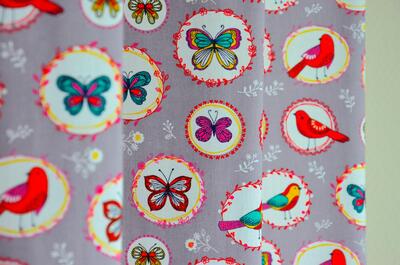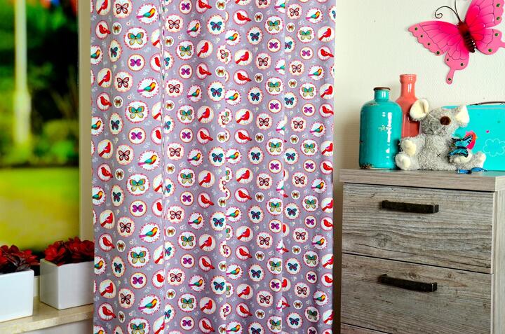 Wie houdt er niet van vlinders en vogels? Op dit kleurrijke kindergordijn heb je ze allebei. Ze zitten allebei mooi in een wit rondje zodat ze heel goed naar voren komen. De rest van het kindergordijn heeft de kleur lila/licht grijs en hierdoor komen de vlinders en vogels helemaal tot hen recht. De samenstelling van dit mooie kindergordijn is 100% katoen en hierdoor is het heerlijk soepel en zacht in omgang. Je kan het ook nog in ons atelier laten voeren met verduisterend gordijn. Zo ben je in één keer klaar. Weet je dat het patroon zich om de 32 cm herhaalt. Dus nog meer vlinders en vogels om naar te kijken. Kun jij ze allemaal benoemen?