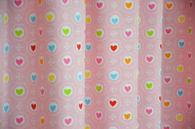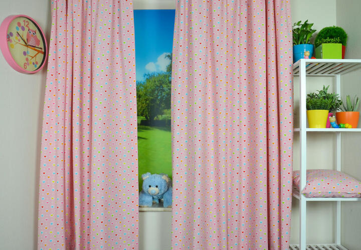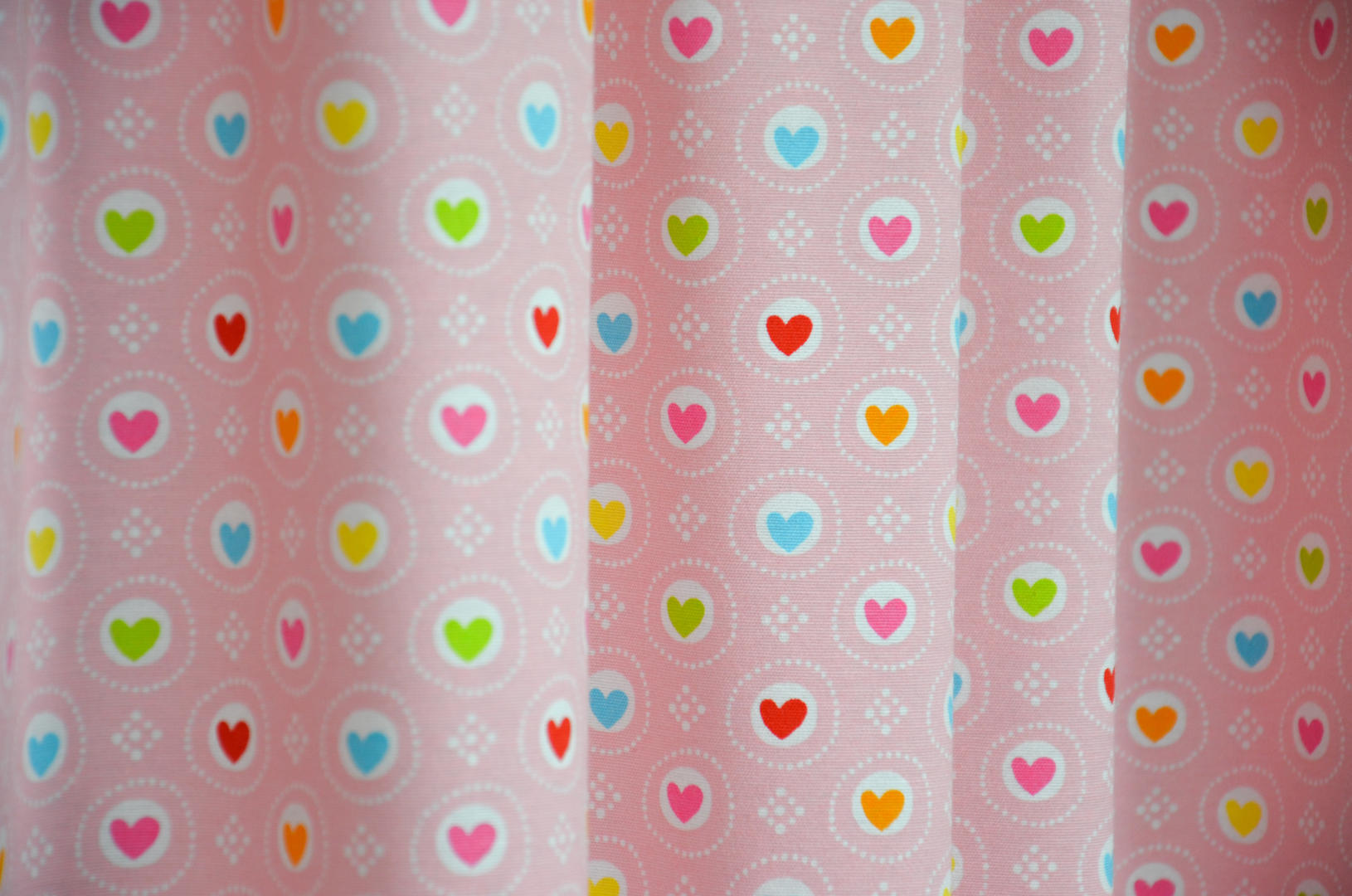 Schattig voor jouw lieve meisje! Dit gordijn heeft het helemaal: Romantische hartjes op een poederig roze ondergrond, gecombineerd met frisse tinten. Je kan turqoise blauw op de muur schilderen of is zacht groen meer jouw kleur? Bij dit gordijn combineert het allemaal super! De hartjes zijn rustig repeterend, waardoor het gordijn uitstekend tot de grond geconfectioneerd kan worden. Voor verduistering kan het gordijn desgewenst gevoerd worden.