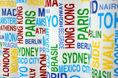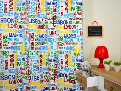Op reis door de eigen kinderkamer? Dat kan met dit wereldse gordijn! Het katoenen gordijn is bedrukt met namen van steden uit allerlei continenten en verkrijgbaar in een gekleurde uitvoering en een zwart-wit variant.