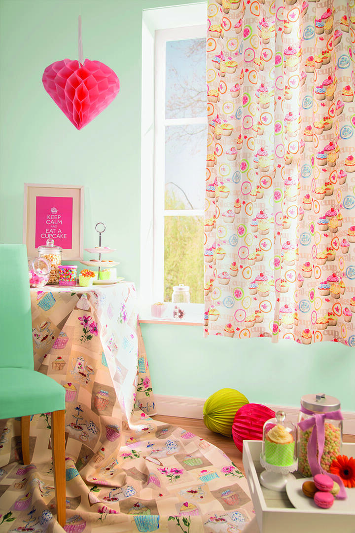 Dat geldt zeker ook voor deze gordijnstof met de naam Cupcakes, een unieke gordijnstof met een keuken dessin.