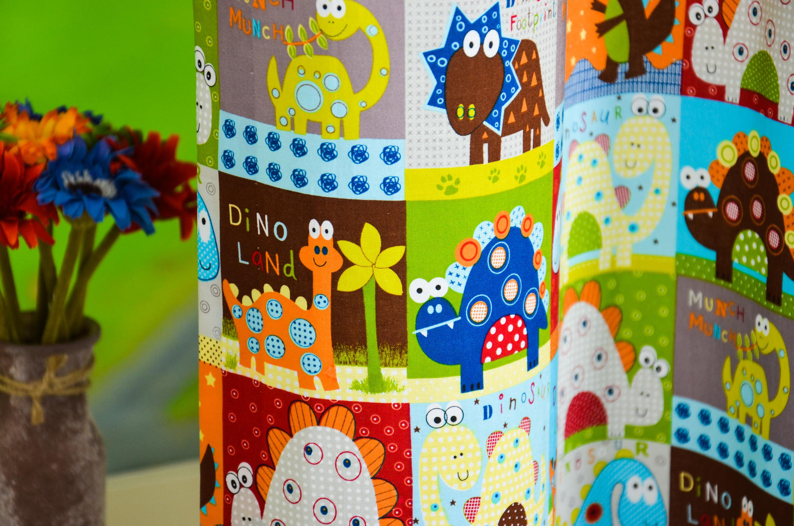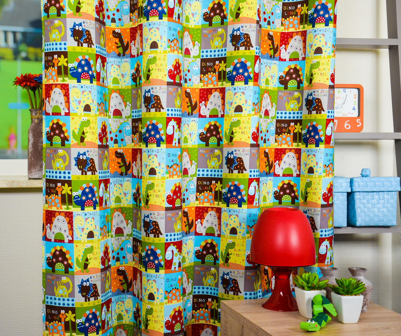 Een DINO gordijn verveeld nooit! Kijk naar de succesvolle dinosaurusfilms en de TV serie Platvoet en zijn vriendjes. Het dier uit lang vervlogen tijden heeft iets magisch! De T-rex en soortgenoten zijn hier gedrukt op matte, gladde stof. De kleuren zijn warm gekozen van taupe grijs, olijfgroen en steenrood. De vlakken zijn 8 x 8 cm. Dit gordijn kan je combineren met sterrenbehang, strepen of gewoon effen. En natuurlijk jouw lieve DINOknuffel op bed. Voor een verduisterend effect even laten voeren.