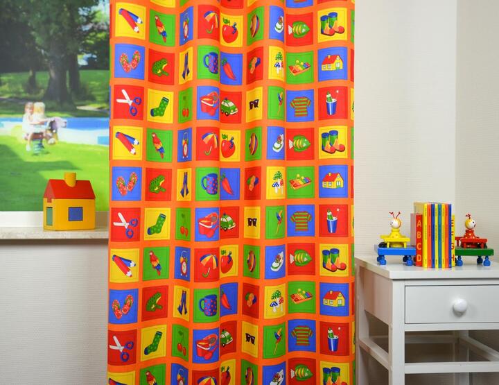 Vrolijk kindergordijn ontworpen door Monica Maas met zomerse taferelen. De felle kleuren en verschillende afbeeldingen zorgen voor een levendige kinderkamer. Het kindergordijn is geschikt voor zowel voor jongetjes als meisjes.