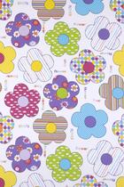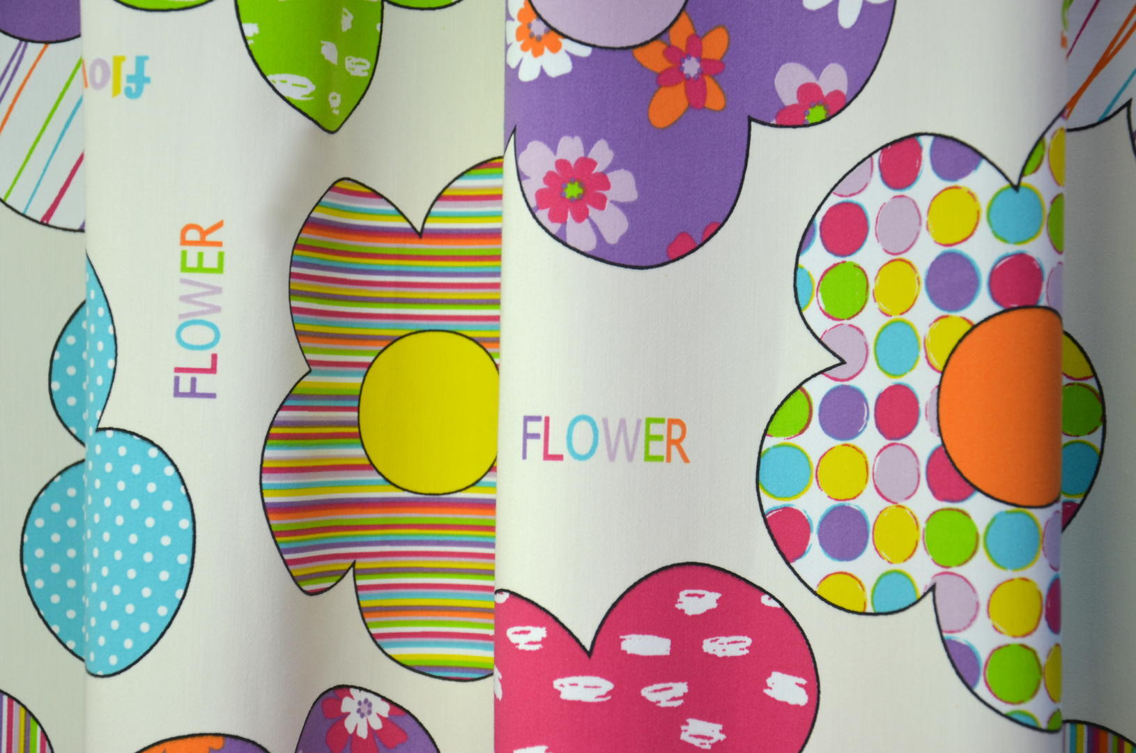 Strepen, stippen, rondjes: de bloemen op dit fleurige zachte gordijn zijn allemaal anders ingevuld.