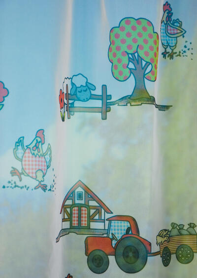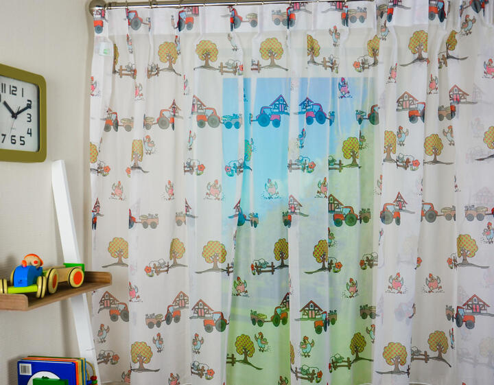 Dat is leuk! Juist ‘de transparant’ met een motief! Een luchtige voile om de inkijk overdag weg te nemen. Heel goed te combineren met verduisterende (effen) gordijn of wellicht ter decoratie naast een verduisterend rolgordijn. Het boerderijthema is in horizontale banen zichtbaar, waardoor het rustig doorloopt. De tracktor met kar is 20 cm lang en de print is op zowel de voor- als achterzijde goed zichtbaar. Ga jij voor deze decoratieve vitrage?