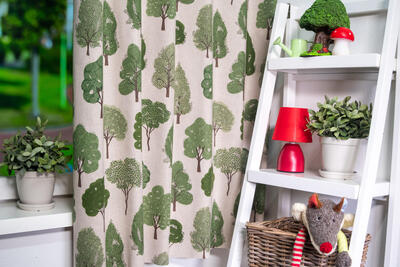 Prachtige linnenlook gordijnen met rustgevende illustraties van diverse bomen in het bos.