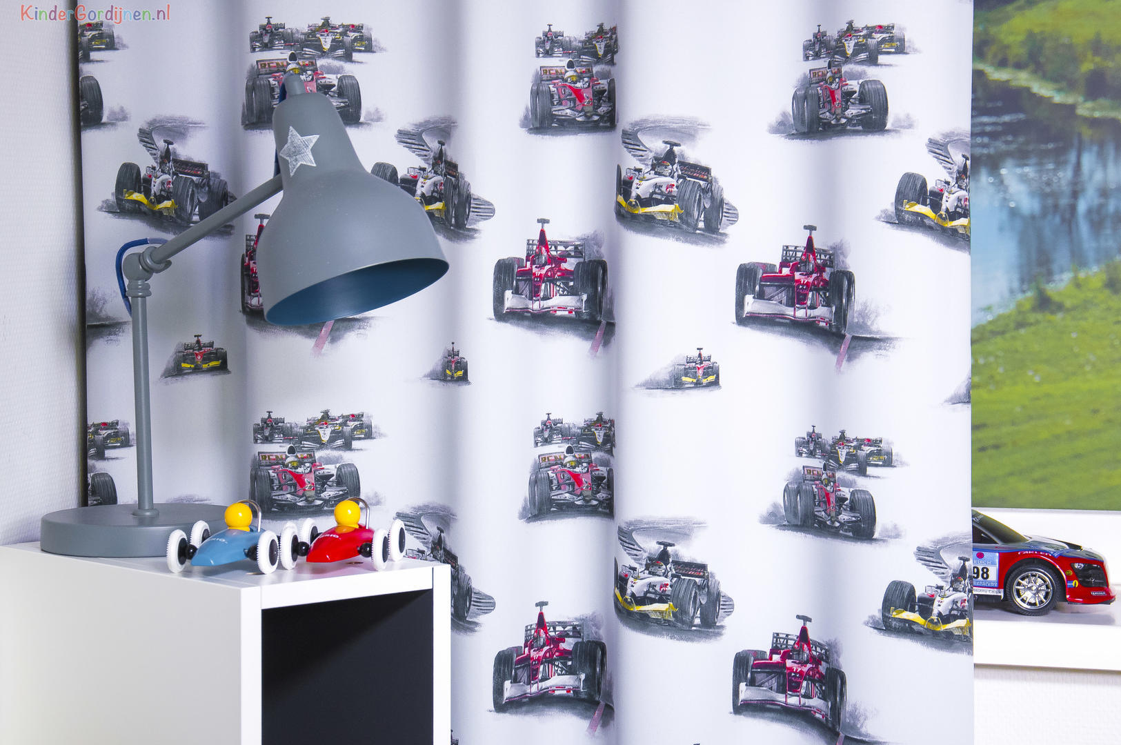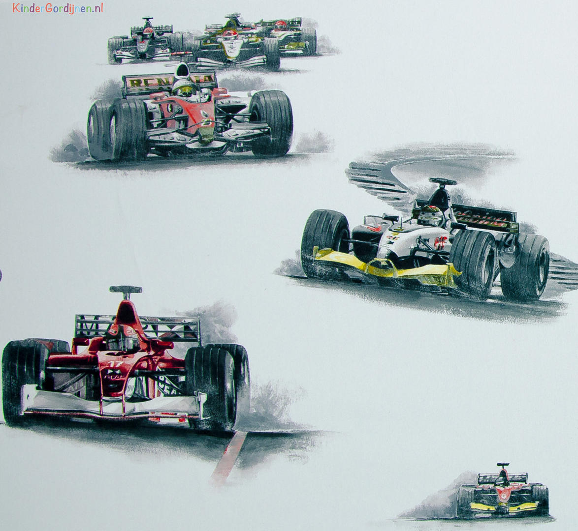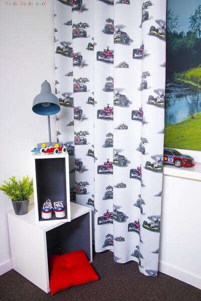 Formule 1 RACING is HOT! Welke jongeman wil er nu niet een gordijn met race auto’s erop, nu onze coureur Max Verstappen zulke mooie successen boekt! Daarbij is hij de jongste debutant aller tijden. Een fantastische jongensdroom die uitkomt! Dit gordijn laat de (jonge) mannen heerlijk fantaseren over de Grand Prix. De royale afbeeldingen zijn gedrukt op Semi dimm-out stof. Dat geeft een stoer uiterlijk. De ondergrondkleur is heel subtiel,. De race auto’s zijn 20 cm groot en 10 cm hoog. De kans is groot dat je vader je nu óók wel heel graag naar bed wil brengen, als je zo’n ‘snelle’ thema kamer krijgt!