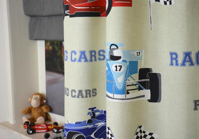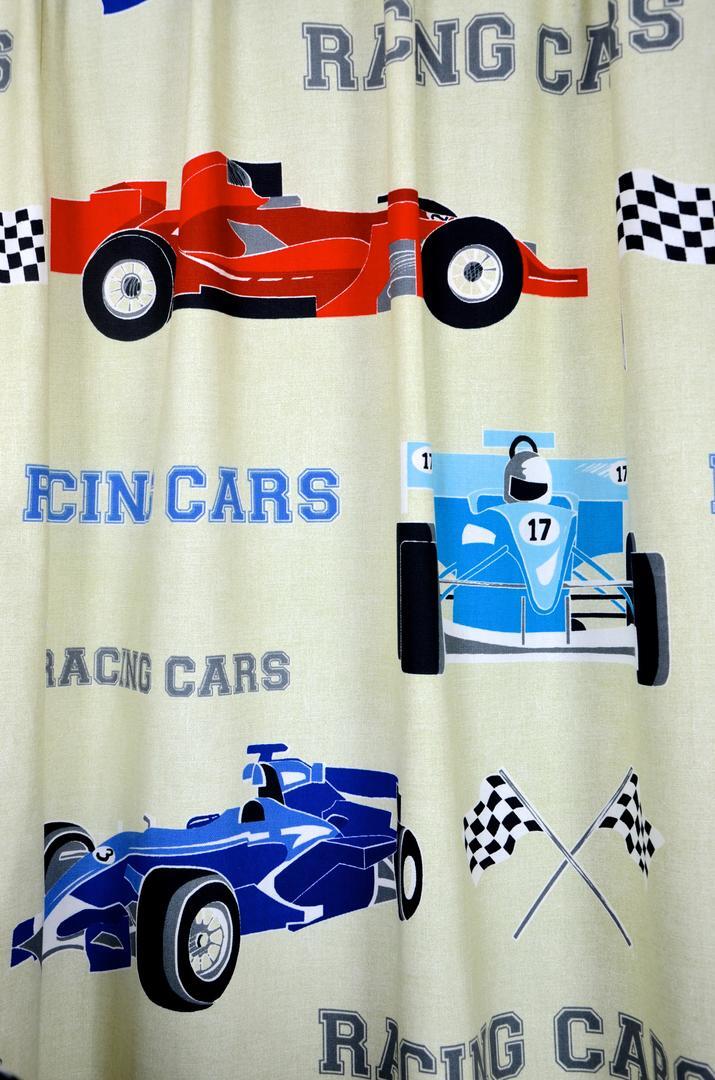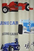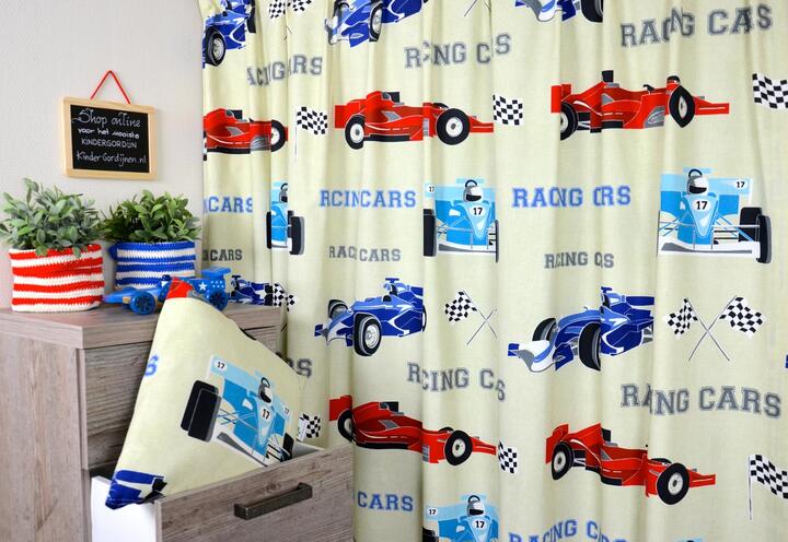 Formule 1 RACING is HOT! Welke jongeman wil er nu niet een gordijn met race auto’s erop, nu onze coureur Max Verstappen zulke mooie successen boekt! Daarbij is hij de jongste debutant aller tijden. Een fantastische jongensdroom die uitkomt! Dit gordijn laat de (jonge) mannen heerlijk fantaseren over de Grand Prix. De royale afbeeldingen zijn gedrukt op dicht geweven, matte katoen. Dat geeft een stoer uiterlijk. De ondergrondkleur is heel subtiel, poederig groen. De race auto’s zijn 25 cm groot en 10 cm hoog. De kans is groot dat je vader je nu óók wel heel graag naar bed wil brengen, als je zo’n ‘snelle’ thema kamer krijgt!