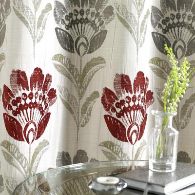 De Bordeaux is een geweven gordijnstof met eigentijdse gestileerde bloemen, geometrie combineert met gedurfde kleuren, stijlvol en opvallend!