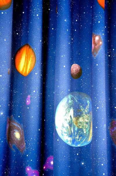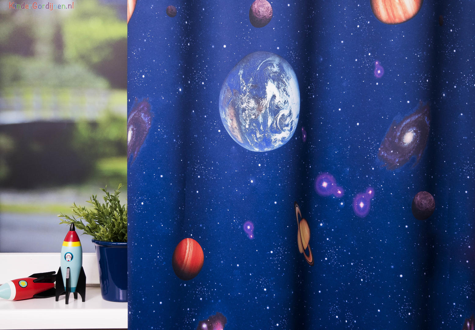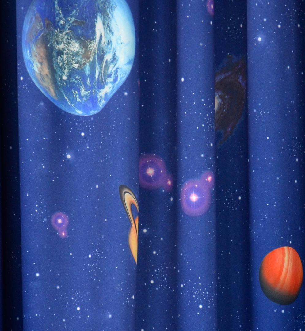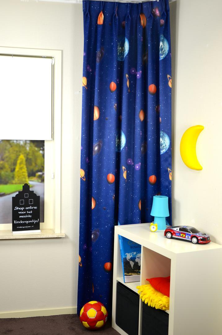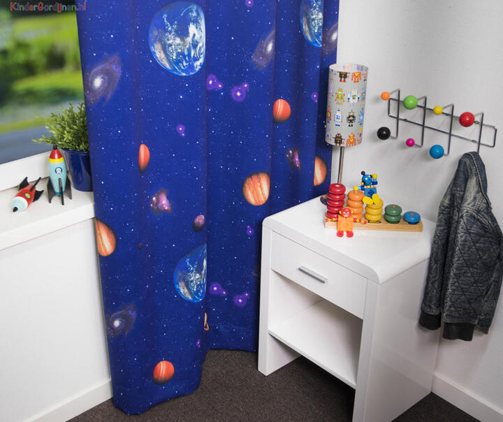 “The sky is the NOT the limit” bij dit gewéldige kindergordijn! We gaan een stapje verder, naar de ruimte en onderzoeken het heelal. Wie zou niet in de voetsporen van André Kuipers willen treden? Deze Nederlandse ruimtevaarder heeft ervaren hoe het is om werkelijk te zweven. Met dit zgn. dim out gordijn kan je met plezier wegdromen naar verre planeten en zonnestelsels. De print is er door een speciale grafische druktechniek ‘knetter-scherp’ aangebracht. De stof is aan de voorzijde nachtblauw en maakt jouw kamer direct lekker donker zonder extra voering. De achterzijde is egaal gebroken wit, wat prettig is voor de warmte wering. Door het tijdloze sterrenthema op dit gordijn, kan jouw eigen astronaut héérlijk lang genieten van dit decoratieve plaatje. Ga je mee op deze ruimte reis?