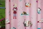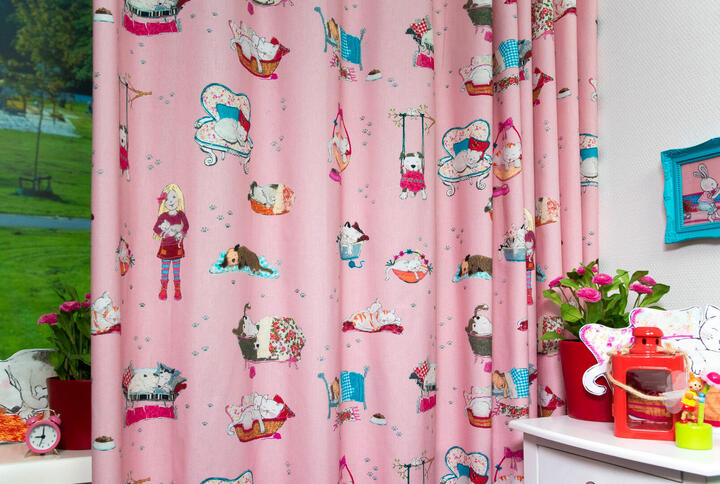 Een súper schattig gordijn voor de kinderkamer, ontworpen door Hanneke de Jager. Deze beeldend kunstenares is schrijver en tevens illustrator van een aantal bijzonder leuke kinderboeken. Zij omschrijft haar stijl als: “Fris, kleurrijk, levendig, speels en zonnig.” Door gebruik van verschillende materialen zoals stofjes van de markt, knopen en gebreide truien, geeft zij haar illustraties iets unieks. In het patroon zie je namelijk de weergave van die leuke details van de verschillende texturen. Zo heeft het slapende hondje een optisch stukje schipperstrui en zijn elegante poezenvriendje een rozenstofje op de sofa. Het stylen van de kinderkamer is geweldig leuk om te doen en hoe bijzonder is het om een gordijn van een échte ontwerpster te hebben! Dit kindergordijn is gedrukt op pastel roze, matte en soepel vallende stof. De print is aan de voorzijde gedrukt en als je goed kijkt zie je die kenmerkende ‘Hanneke’ details. Zij tekent hele mooie prinsessen boeken en hier zijn in dat genre verschillende, vertederende huisdieren afgebeeld. Tot de kleine, lieve kattenpootjes aan toe. Wil je ook nog lekker donker slapen, dan kan het gordijn verduisterend gevoerd worden. Kortom, wil jouw eigen prinsesje op een bijzondere manier naar dromenland? Geef je eigen knuffel dan een fantasierijk Hanneke de Jager kindergordijn!