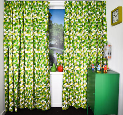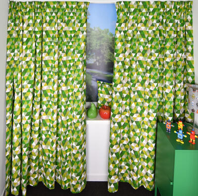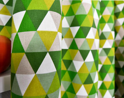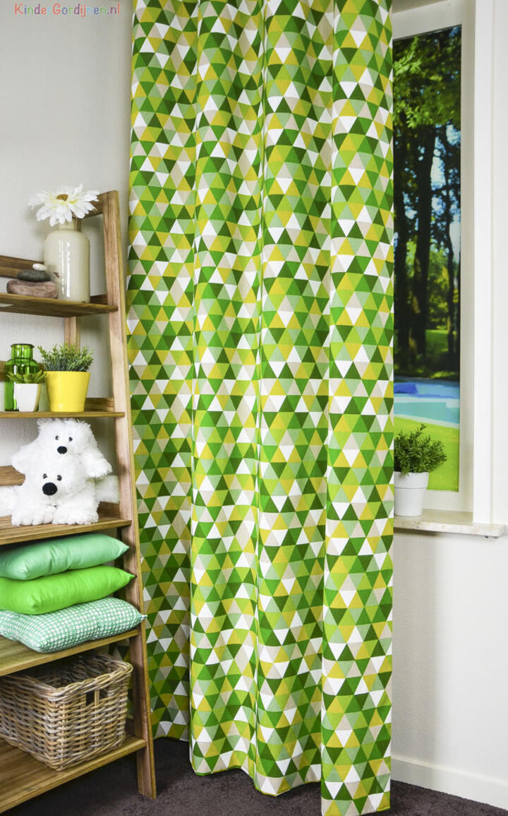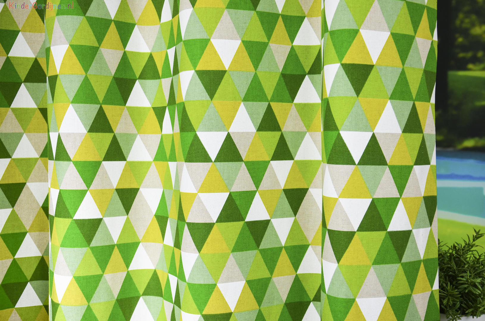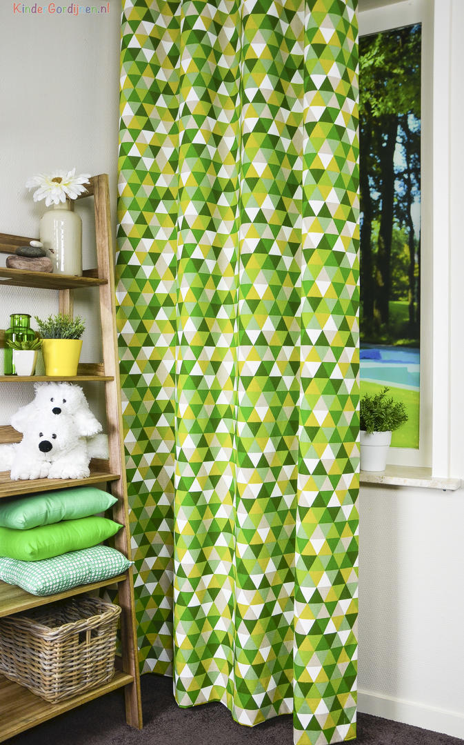 Robuust gordijn met Scandinavische design uitstraling. De rustig herhalende grafische patronen in een frisse kleur, lenen zich zelfs voor grote raamoppervlakten. Hier is gekozen voor frisgroen, petrol en wit, gedrukt op een fraaie linnenkleur. De achterzijde van de stof is effen. De gelijkzijdige driehoekjes (5 cm per zijde), zijn puur en rijk van kleur, waardoor dit gordijn óók voor de hippe jong volwassene geschikt is. De Scandinavische woonstijl combineert uitstekend met wit, wit tinten en natuurlijke materialen. Een rotan stoeltje erbij en emaille lamp, zie je het perfecte plaatje al voor je?