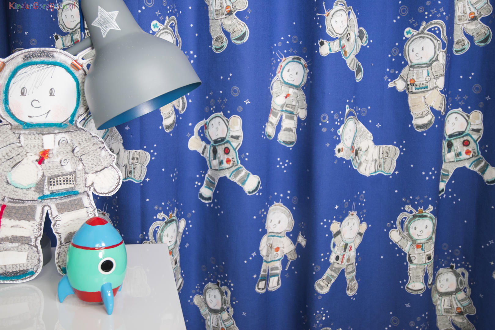 Dansend tussen de planeten, doe mee met deze vrolijke astronauten en waan jezelf tussen de sterren. Galaxy en ruimtevaart gordijnen zijn erg populair bij kinderen. De print op dit gordijn is naar ontwerp van illustrator Hanneke de Jager. Het kindergordijn is verkrijgbaar in twee verschillende kleuren, blauw en wit. De samenstelling is 100% van katoen en de breedte van de stof is 140 cm. Het gordijn is te bestellen als op maat gemaakt geplooid gordijn maar is ook als losse gordijnstof verkrijgbaar. Op zoek naar een verduisterend gordijn? Net als alle andere gordijnen is ook dit astronauten gordijn verduisterend te maken met een voering. Dit is eenvoudig aan te vinken in het bestelproces.