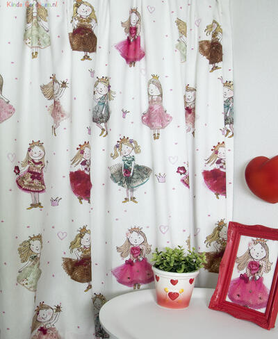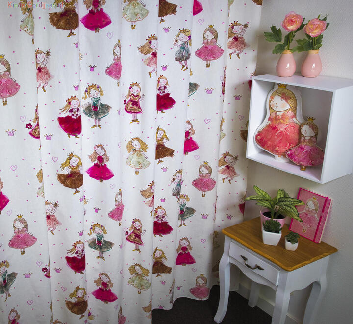 Een súper schattig prinsessengordijn voor de kinderkamer, ontworpen door Hanneke de Jager. Deze beeldend kunstenares is schrijver en tevens illustrator van een aantal bijzonder leuke kinderboeken. Zij omschrijft haar stijl als: “Fris, kleurrijk, levendig, speels en zonnig.” Door gebruik van verschillende materialen zoals stofjes van de markt, knopen en gebreide truien, geeft zij haar illustraties iets unieks. In het patroon zie je namelijk de weergave van die leuke details van de verschillende texturen. Zo heeft het prinsesje een haast levensechte roos vast en haar vriendin en sprankelende toverstaf. Het stylen van de kinderkamer is geweldig leuk om te doen en hoe bijzonder is het om een gordijn van een échte ontwerpster te hebben! Dit kindergordijn is leverbaar in 2 verschillende ondergrondkleuren: Pastel roze en fris wit. De stof is fraai mat en soepel vallend. De print is aan de voorzijde gedrukt en als je goed kijkt zie je die kenmerkende ‘Hanneke’ details. Zij tekent hele mooie prinsessen boeken en hier zie je de vrolijke dametjes bijna fotografisch afgebeeld, alsof zij zó uit het boek zijn gedanst. Wil je ook nog lekker donker slapen, dan kan het kindergordijn verduisterend gevoerd worden. Kortom, wil jouw eigen danseresje op een bijzondere manier naar dromenland? Geef je eigen prinsesje dan een fantasierijk Hanneke de Jager kindergordijn!