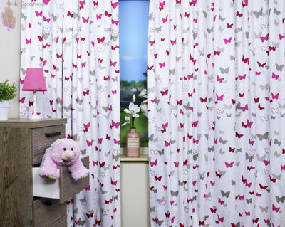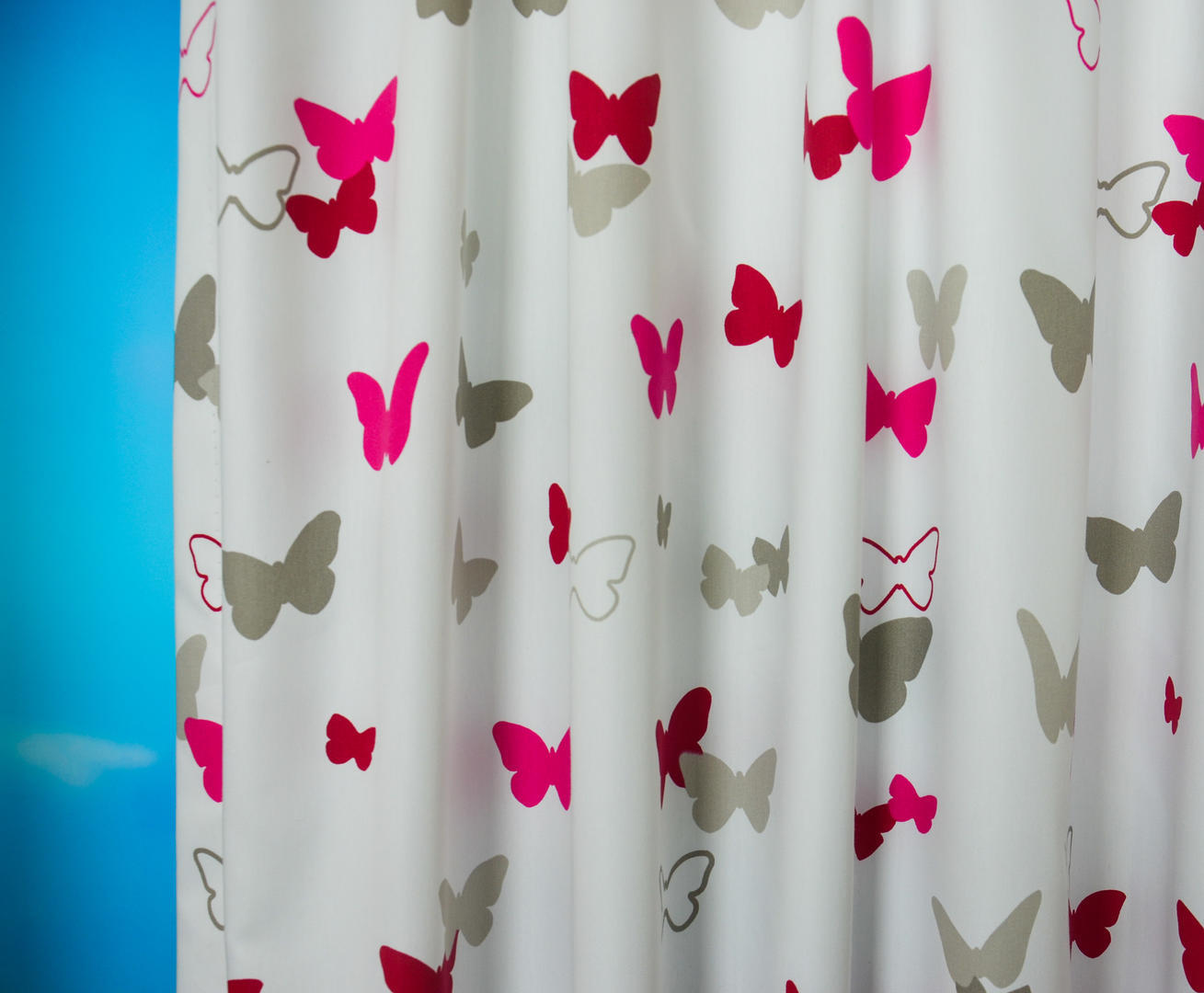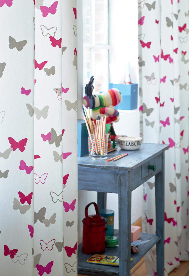 Vlinder, vlinder zoek me dan. Vliegen zó luchtig en sierlijk, ik kan daar wat van. Een vlinder verrast en streelt het oog, wat bijzonder om dat op een gordijn te ‘vangen’. Kunstzinnig en een ideale inspiratiebron voor een prachtig kindergordijn. De stof is leverbaar in 2 verschillende kleur paletten: een fris witte ondergrond met fuchsia roze en fraaie grijstinten of pastel roze met warm camel grijs. De stof is heel mooi glad geweven en heeft haast een luchtige satijn uitstraling. Het gordijn komt daardoor prettig fris en tijdloos over. Ook leuk om een tintje op de muur te schilderen, dat geeft een extra sprankelend effect. Dat kan ook goed in de zachtgrijze kleur van de vlinder. Zie jij het Beach house sfeertje al voor je?