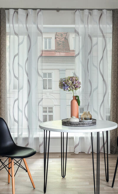 Mooie en unieke transparante vitrages en inbetweens perfect geconfectioneerd, dat is wat we belangrijk vinden. Dat geldt zeker ook voor deze inbetween Audrey. De stof is kamerhoog en voorzien van een loodveter waardoor deze inbetween altijd mooi in de plooi valt. De Audrey komt het mooist tot z’n recht met een vlinder of tri-plooi.