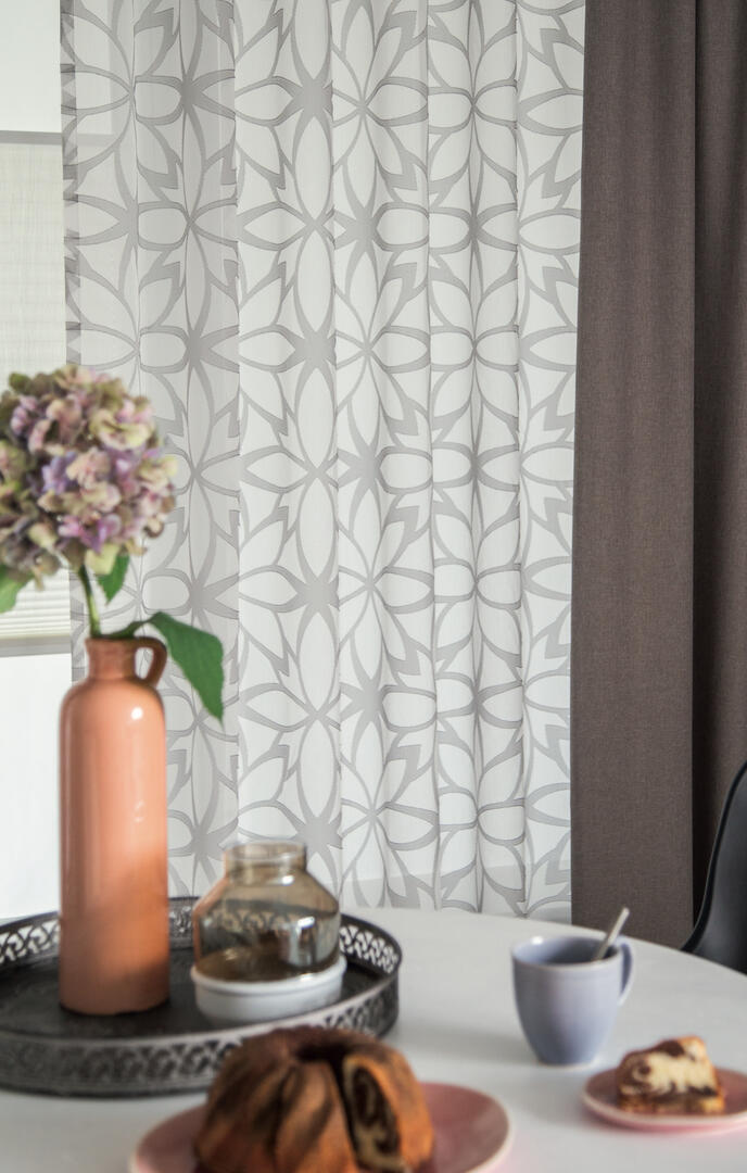 Mooie en unieke transparante vitrages en inbetweens perfect geconfectioneerd, dat is wat we belangrijk vinden. Dat geldt zeker ook voor deze inbetween Yelena. De stof is kamerhoog en voorzien van een loodveter waardoor deze inbetween altijd mooi in de plooi valt. De Yelena komt het mooist tot z’n recht met een vlinder of tri-plooi.