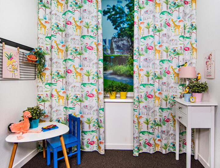 Dat geldt zeker ook voor deze gordijnstof met de naam In the Zoo, een unieke gordijnstof met een jungle en safari dessin.