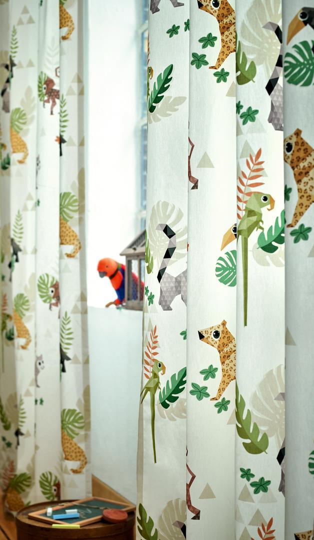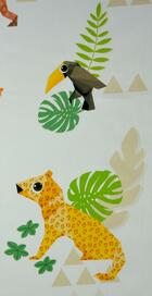 Héérlijk satijnzachte stof zorgt ervoor dat dit gordijn ‘valt als een klok’. Ook het royale patroon maakt dit kindergordijn extra bijzonder. De jaguar is b.v. 18 x 20 cm groot. Dit geeft een rustig en ruimtelijk effect aan de slaapkamer. De stof is mat en de ondergrond warmwit. De jungle dieren zijn gedrukt in rustig gedekte kleuren, waardoor de tinten fraai poederig overkomen. Ideaal wanneer je een patroon wenst wat niet té veel overheerst. Voor verduistering graag even laten voeren.