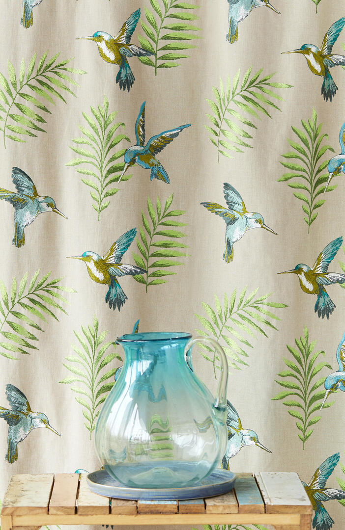 Dat geldt zeker ook voor deze gordijnstof met de naam Kingfisher, een unieke gordijnstof met een vogels dessin.