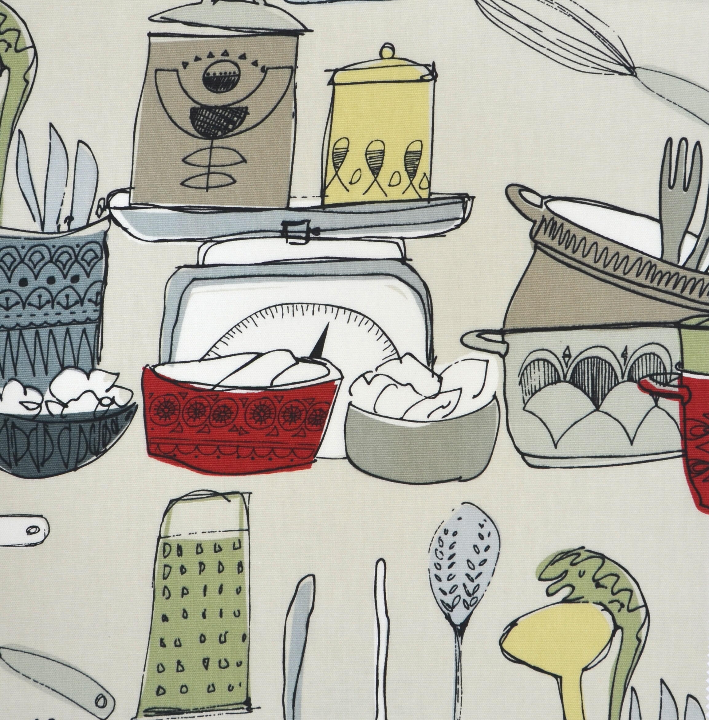 Wie kookt er nou niet graag in een gezellige keuken? Creëer een knusse sfeer met deze getekende keukengereedschappen in allerlei felle kleuren. Wij kunnen de stof gratis verwerken tot kant-en-klaar gordijn. Wilt u graag verduisterende gordijnen? Dat kan! Vink de optie aan in het bestelproces.