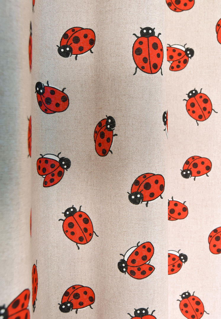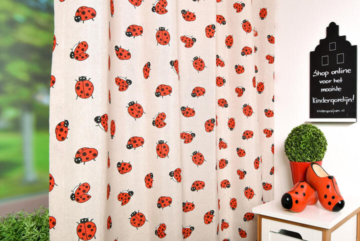 LIEF, LIEF, LIEVEbeestje . Oeps, lieveheersbeestje! Schattig toch om daar een gordijn van te hebben?! De lieveheersbeestjes zijn gedrukt op kamerhoge, stevige stof en zijn zo’n 5 cm groot. Licht geribd van structuur en daardoor een vlotte uitstraling. De ondergrond is warm grijs en daardoor makkelijk te combineren met andere kleuren. Klei en leem tinten, samen met sloophout is hierbij altijd perfect! Mogen deze lieve diertjes bij jou komen wonen?
