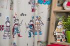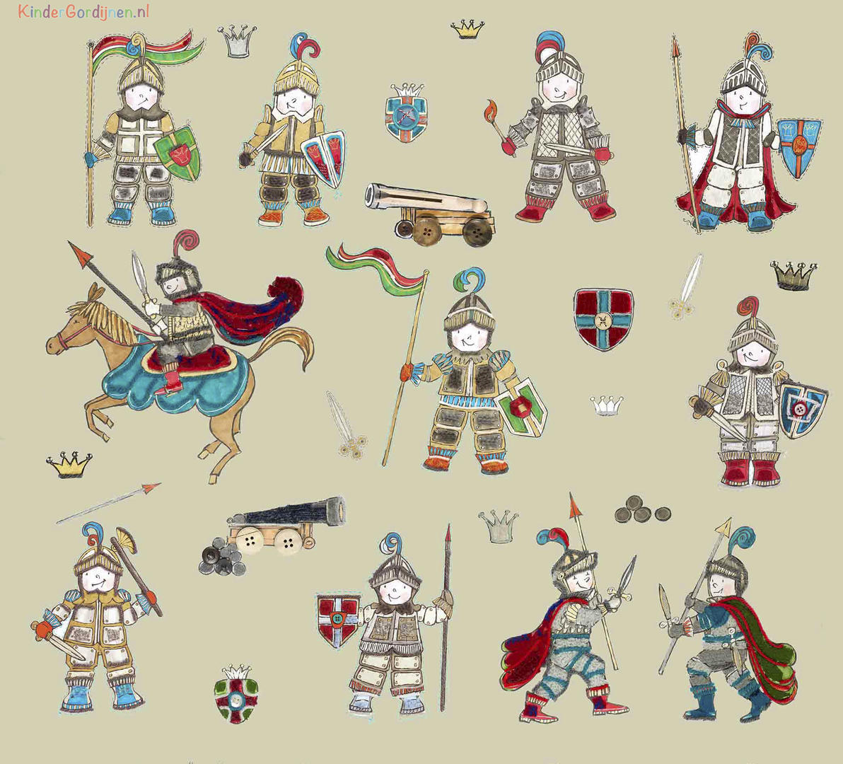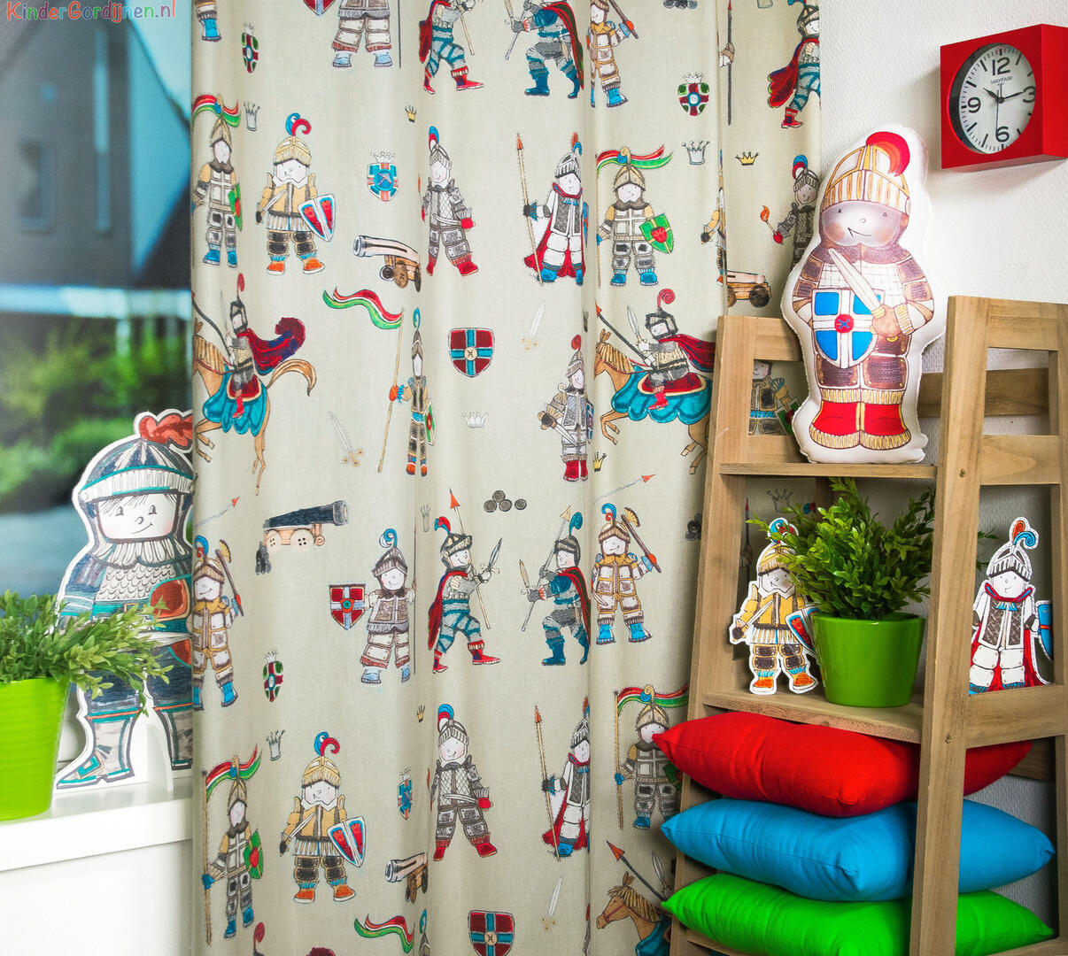Dappere ridders uit vervlogen tijden op dit kindergordijn, ontworpen door Hanneke de Jager. Deze beeldend kunstenares is schrijver en tevens illustrator van een aantal bijzonder leuke kinderboeken. Zij omschrijft haar stijl als: “Fris, kleurrijk, levendig, speels en zonnig.” Door gebruik van verschillende materialen zoals stofjes van de markt, knopen en gebreide truien, geeft zij haar illustraties iets unieks. In het patroon zie je namelijk de weergave van die leuke details van de verschillende texturen. Zo hebben de ridders haast tastbare harnasjes aan, zo écht lijkt het. De schilden zijn afgezet met wol en kleine knoopjes, hoe origineel! Het stylen van de kinderkamer is geweldig leuk om te doen en hoe bijzonder is het om een gordijn van een échte ontwerpster te hebben! Dit gordijn heeft een warm grijze ondergrond en verder aangevuld met warme, fraai verpoederde tinten. De staande ridders zijn 17 cm groot en gedrukt op matte, soepel vallende stof. De print is aan de voorzijde gedrukt en als je goed kijkt zie je die kenmerkende ‘Hanneke’ details. Zij tekent hele mooie kinderboeken en hier zijn in dat genre de vrolijke & trouwe ridders afgebeeld. Ook de kroon en het vaandel e.d. prikkelen je fantasie. Wil je graag lekker donker slapen, dan kan het gordijn verduisterend gevoerd worden. Kortom, wil jouw eigen dappere en trouwe levensgenieter op een bijzondere manier naar dromenland? Kies dan voor dit fantasierijke Hanneke de Jager gordijn!