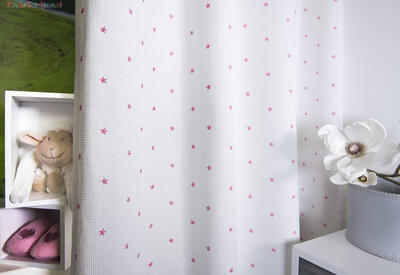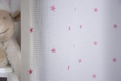SCHATTIG! Een gordijn voor de babykamer dat rustig is en toch extra decoratief. Dat komt door de wafelpiqué structuur. Dit is een heel fijn ingeweven ribje, wat de stof optisch meer warmte geeft. In combinatie met een harde vloer (laminaat/ Novilon) geeft het daardoor een extra aantrekkelijke ‘boost’. De voor- en achterzijde hebben dezelfde kleur. Het geweven sterretje is 1 cm groot. Dit fraaie babykamer gordijn combineert vast & zeker uitstekend met jouw hemeltje/ aankleedkussen en lakentjes.
