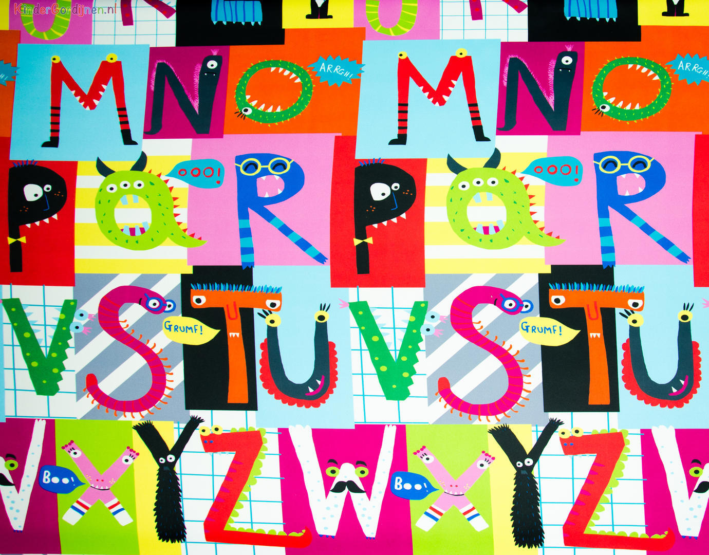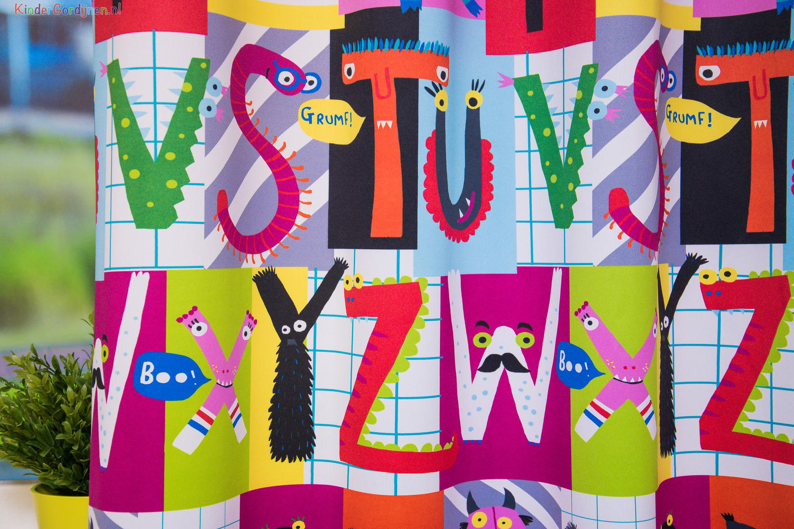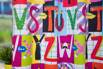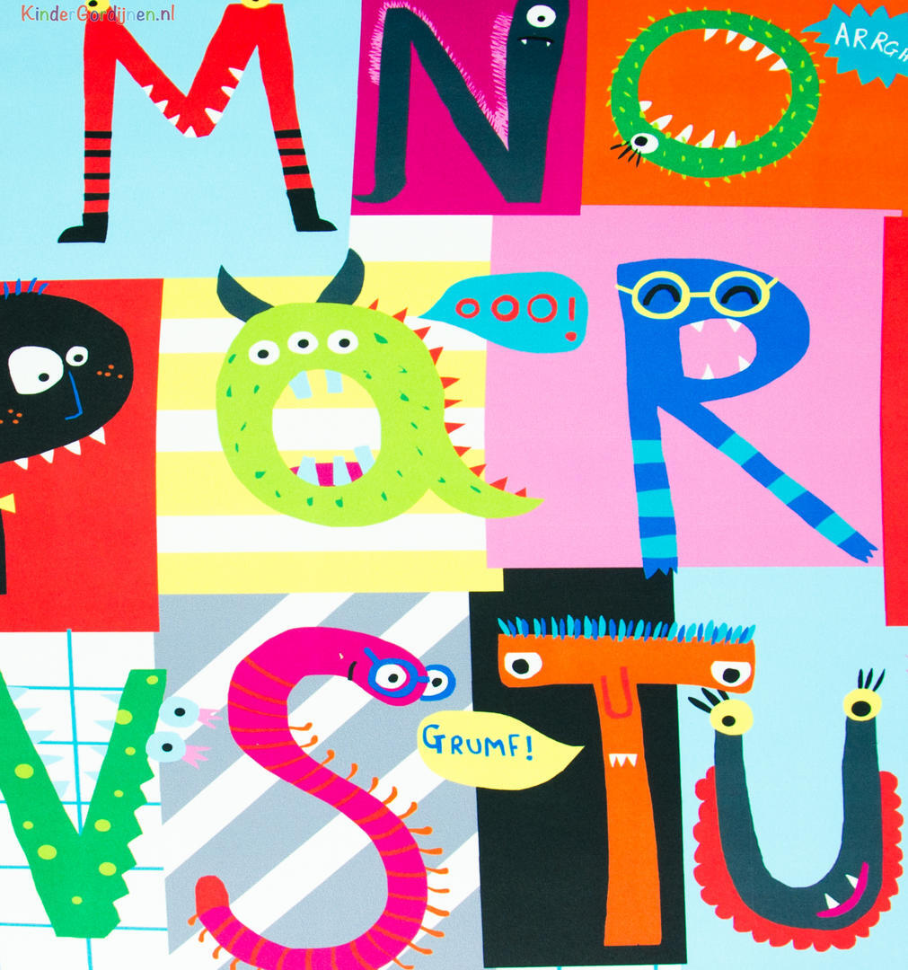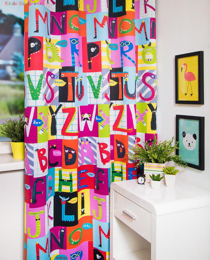 Dat geldt zeker ook voor deze gordijnstof met de naam Looking Letters (verduisterend), een unieke gordijnstof met een educatief dessin.