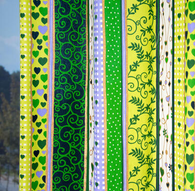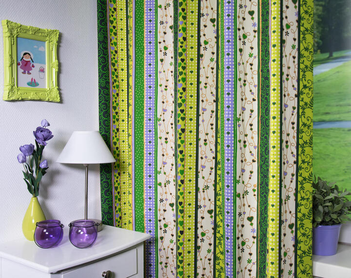 Prachtig gordijn met verticale banen die elk anders zijn bedrukt. De katoenen gordijnstof met gewaagd motief is beschikbaar in verschillende uitvoeringen en past mooi in de meisjeskamer.