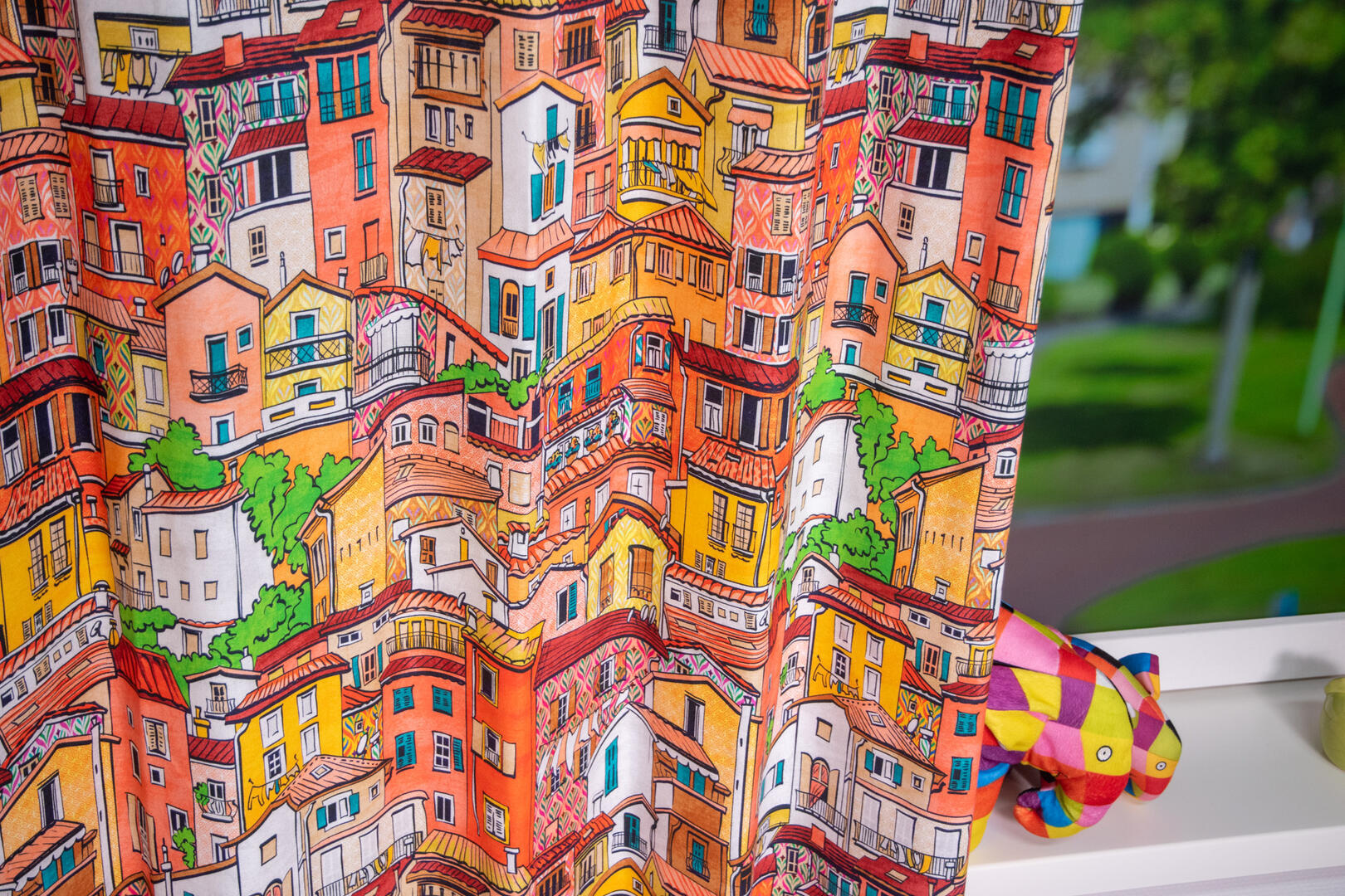 Dat geldt zeker ook voor deze gordijnstof met de naam Maisonnette, een unieke gordijnstof met een wereld en steden dessin.