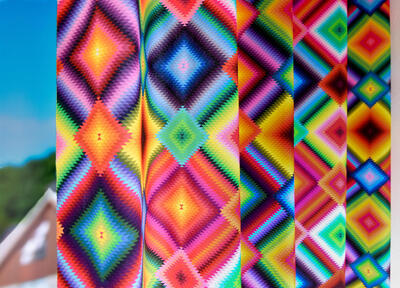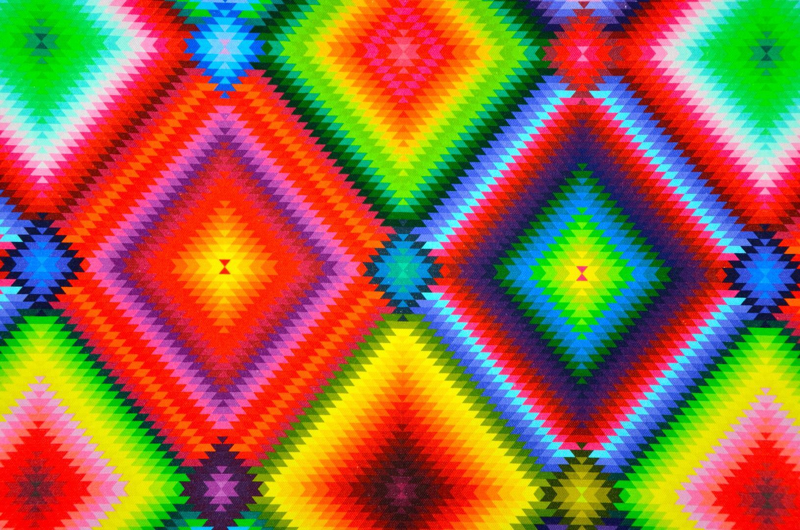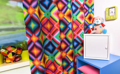 WOW, dit gordijn wil je in het écht zien! De kleuren werken als kunstobject aan wand, betoverend mooi en intens. De vorm lijkt ‘hypnotisch’, zoals het in The Art scène omschreven wordt. De vlakken zijn 20 cm groot en super scherp gedrukt op de dicht geweven matte stof. Dit is een gordijn voor de tiener of jong volwassene die zich durft te onderscheiden! Jij bent niet doorsnee, je bent een prachtig individu. Voor extra kleurbehoud of verduistering graag even voeren. Ook kussentjes zijn mogelijk van dezelfde stof.