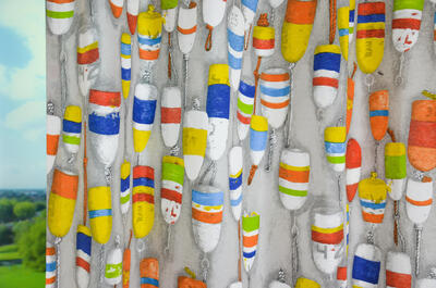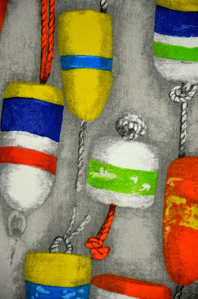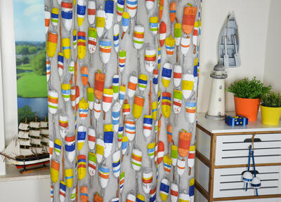 Gewéldige gordijnen voor de watersport liefhebber! De stof is aan de voorzijde bedrukt met drijvers of boeien; officieel ‘stootwill’ genaamd. De stootwil is hier zo’n 12 cm groot. De kleuren zijn toepasselijk in navy stijl gekozen. Het thema kan je uitbreiden met jacht- of zeilboot accessoires of andere strandartikelen. Voor verduistering even laten voeren.