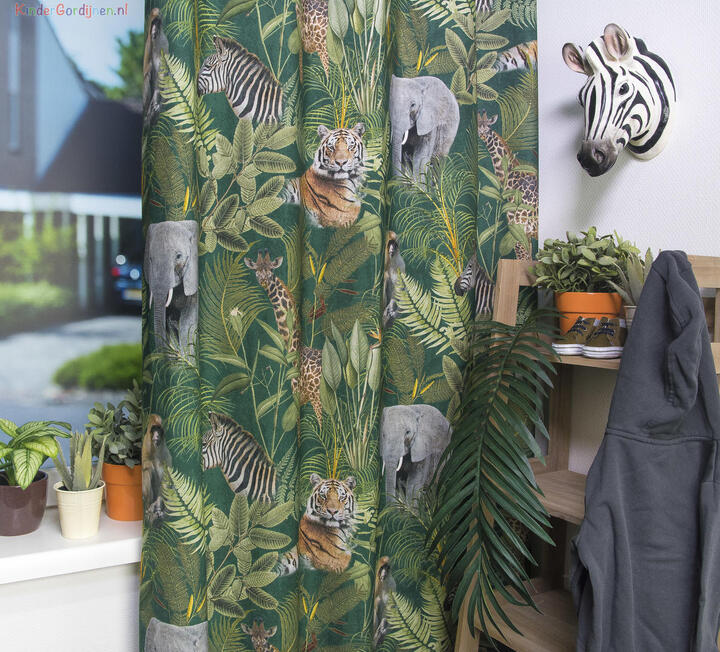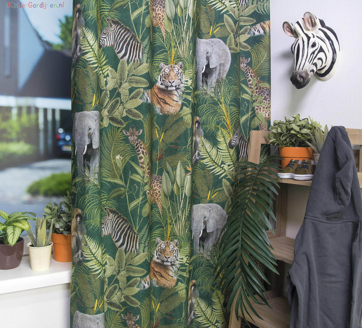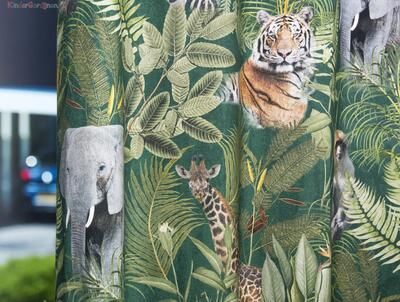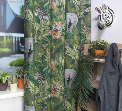 Dat geldt zeker ook voor deze gordijnstof met de naam Moremi, een unieke gordijnstof met een jungle en safari dessin.