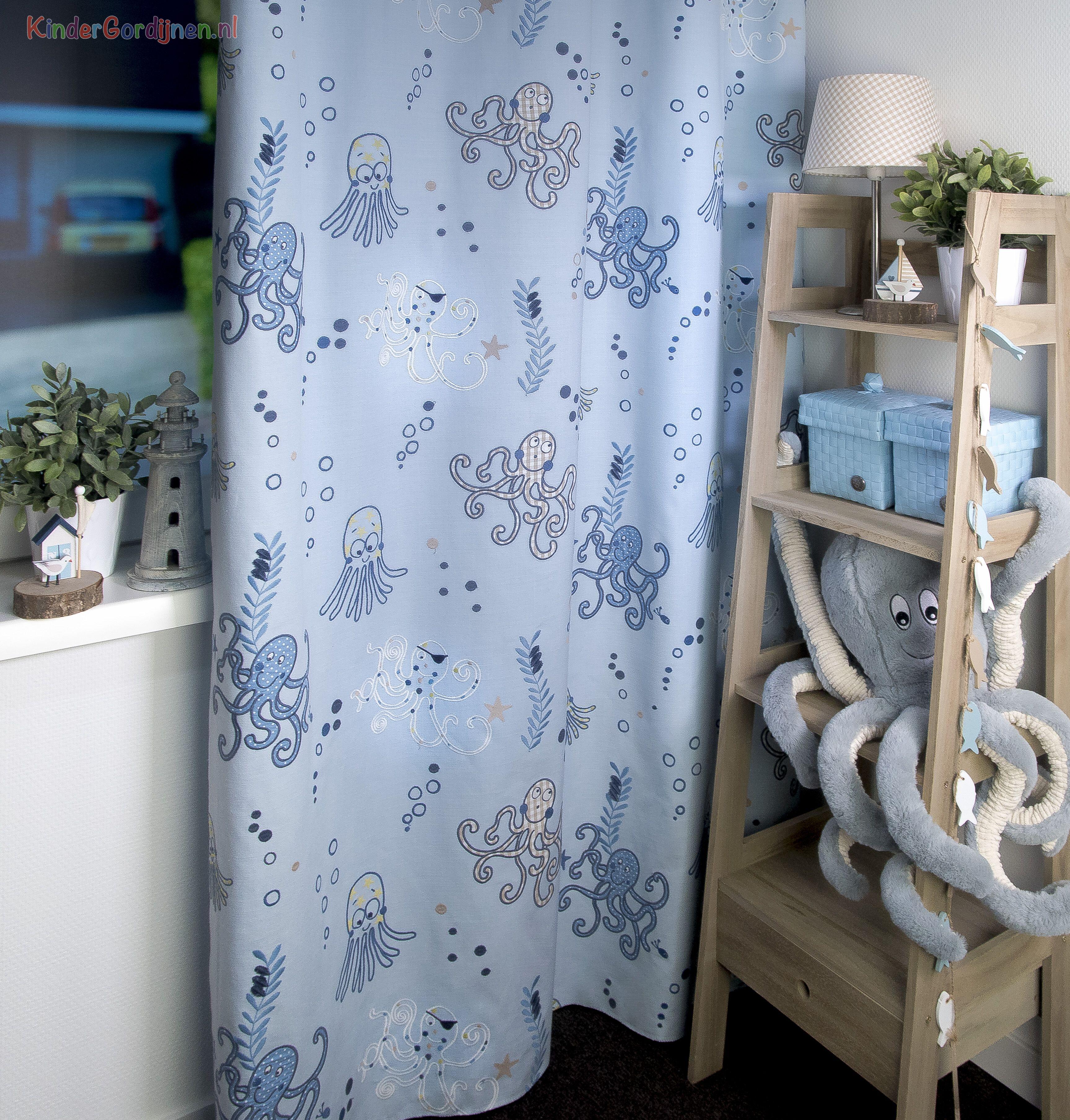 Dit is een bijzondere (nautische) gordijnstof, de octopussen zijn er op geborduurd! sommigen zijn van echte opgestikte patchwork stof gemaakt. Dat geeft een prachtig reliëf aan deze ietwat ruw geweven katoen. Dat effect zorgt zeker voor een extra verfijnde finish aan jouw slaapkamer! Het beestje is zo’n 18 cm groot en zwemt zó jouw kamer in. “swim around lovely octopus!”