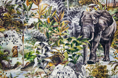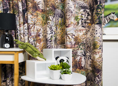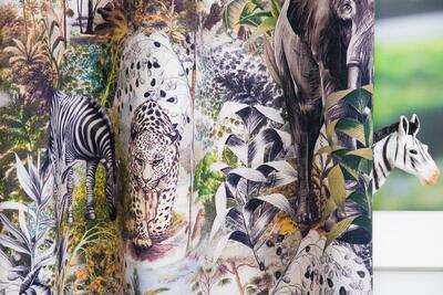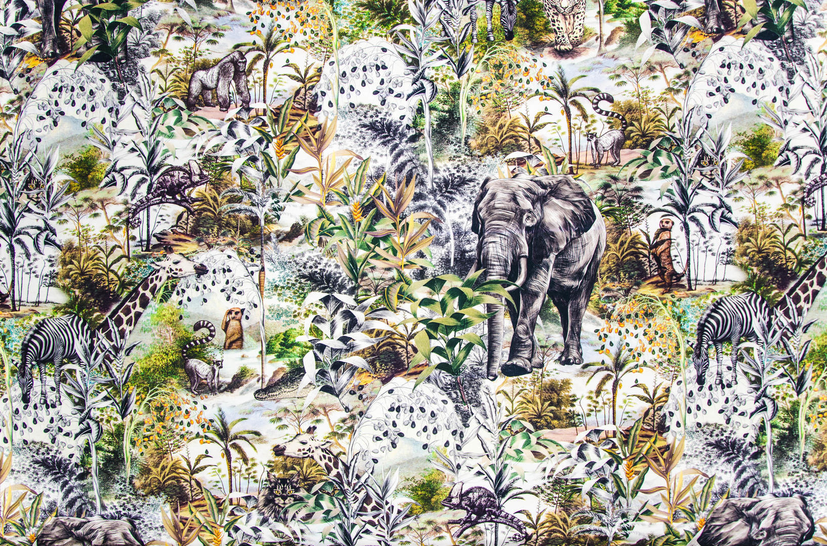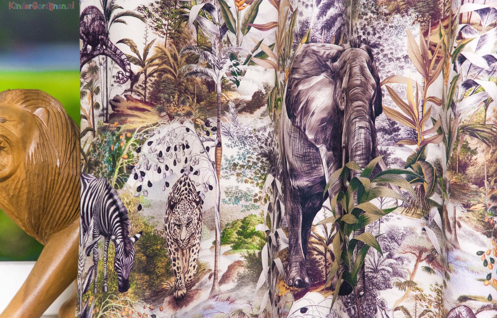 Dat geldt zeker ook voor deze gordijnstof met de naam Okapi, een unieke gordijnstof met een jungle en safari dessin.