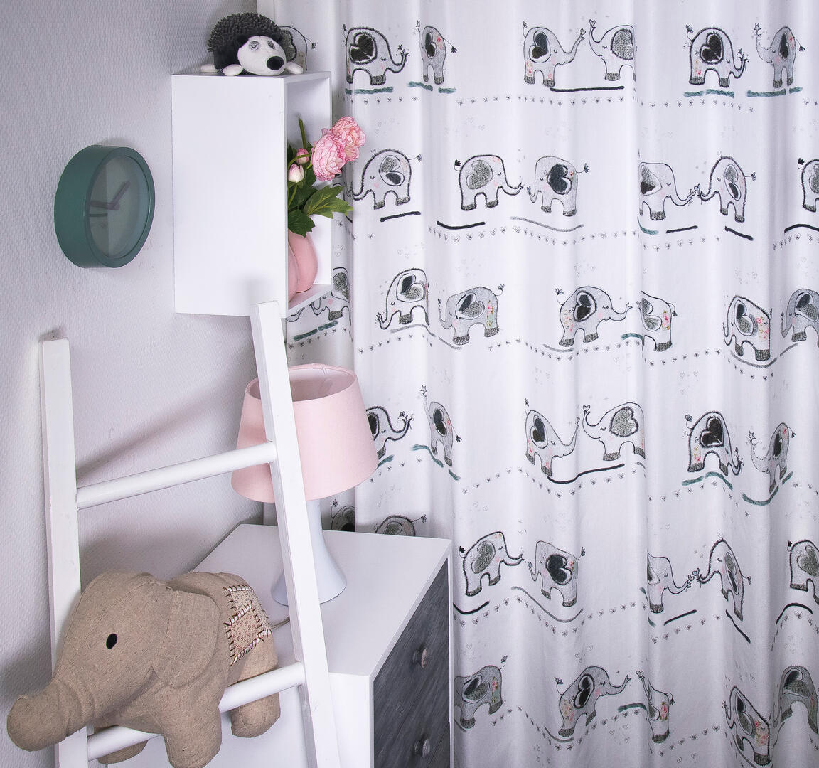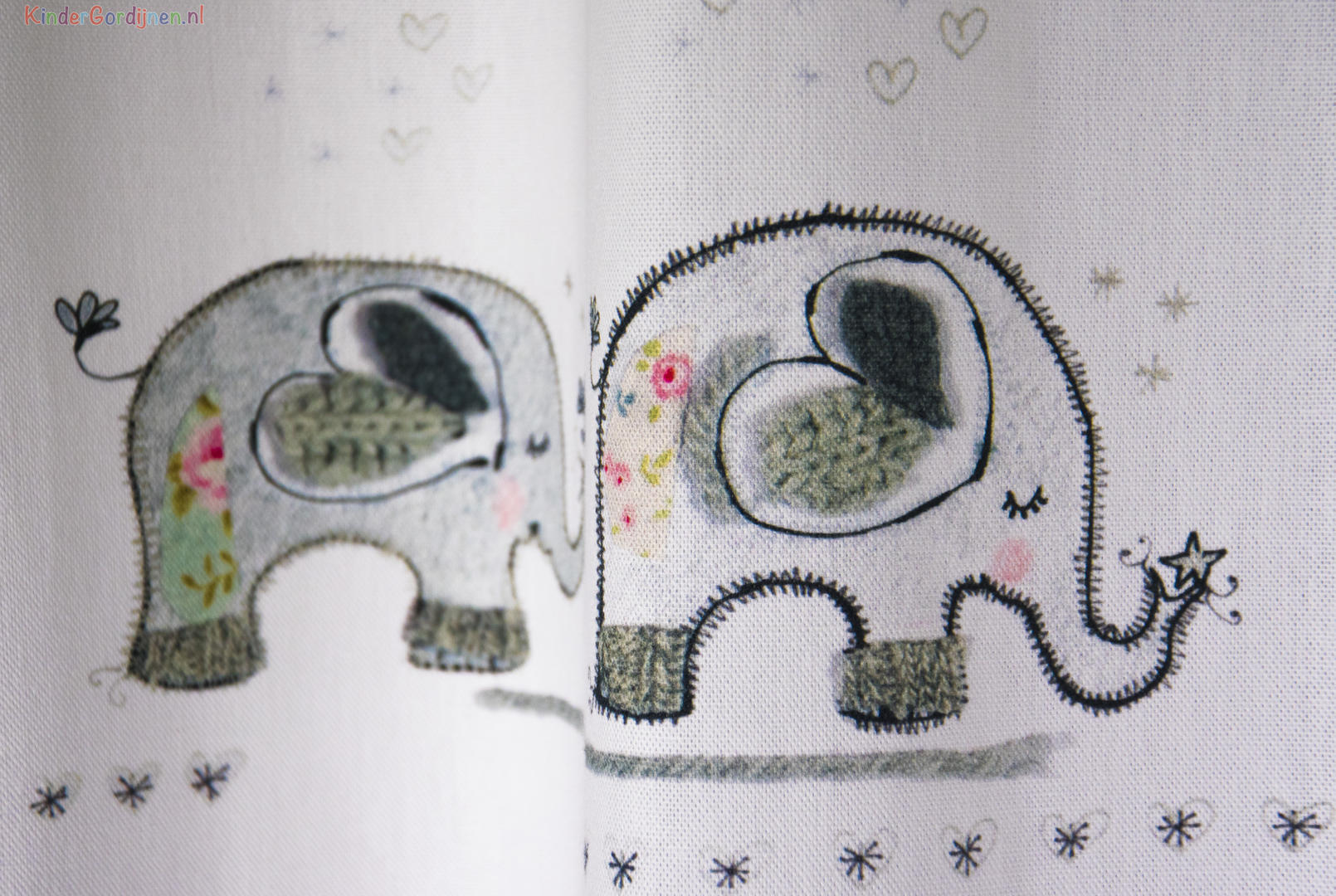Een schattig olifantjesgordijn voor de kinderkamer, ontworpen door Hanneke de Jager. Deze beeldend kunstenares is schrijver en tevens illustrator van een aantal bijzonder leuke kinderboeken. Zij omschrijft haar stijl als: “Fris, kleurrijk, levendig, speels en zonnig.” Door gebruik van verschillende materialen zoals stofjes van de markt, knopen en gebreide truien, geeft zij haar illustraties iets unieks. In het olifantjes patroon zie je namelijk de weergave van die leuke details van de verschillende texturen. Het stylen van de kinderkamer is geweldig leuk om te doen en hoe bijzonder is het om een gordijn van een échte ontwerpster te hebben! Dit gordijn is gedrukt op warm witte, matte en soepel vallende stof. De print is aan de voorzijde gedrukt en als je goed kijkt zie je die kenmerkende ‘Hanneke’ details. Een fijn weergeven stiksel, een hartje van breisel en miniatuur roosjesstof. Ook een bijna aaibaar stukje wollen draad in vergrijsd petrol siert de afbeelding. Het gordijn heeft daardoor allerlei subtiele, fraai verpoederde tinten. Kortom, wil jou lieve kleintje op een bijzondere manier naar dromenland? Geef je eigen ‘knuffel’ dan een fantasierijk Hanneke de Jager gordijn!