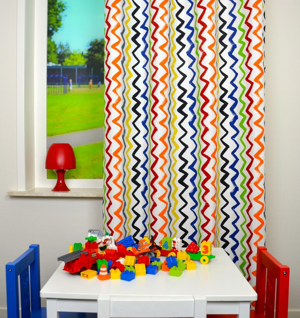 Kindergordijn van katoenen gordijnstof met een kleurrijk zig zag patroon in verticale richting. Het gordijn is beschikbaar in één schitterende kleurcombinatie en vrolijkt elke slaapkamer op.