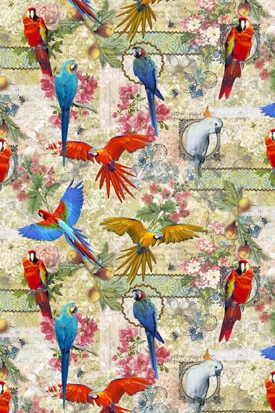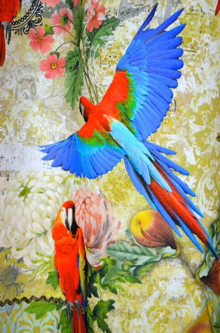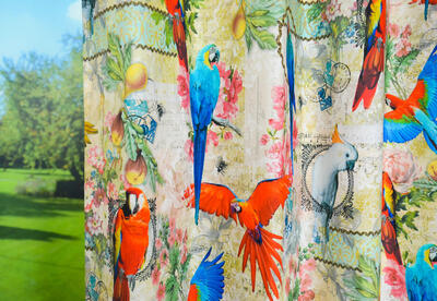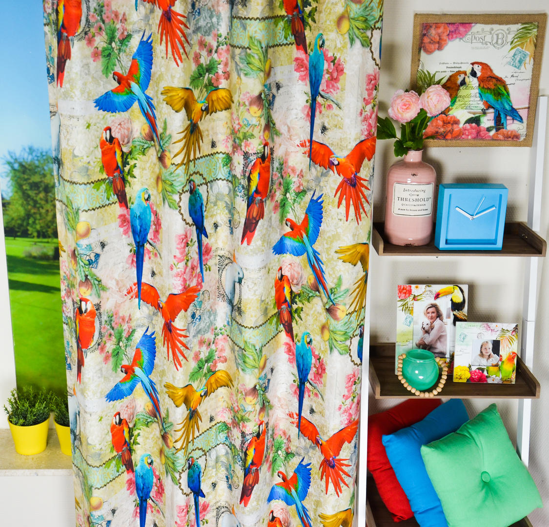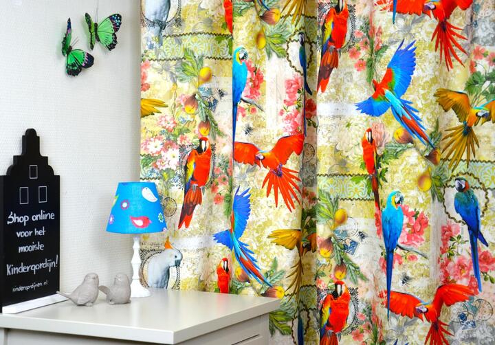 Creëer een zomerse sfeer in de kinderkamer met deze prachtige felgekleurde papegaaien op de gordijnen. Door de haarscherpe illustraties lijken de papegaaien recht de kinderkamer in te vliegen. Dit bonte kindergordijn met exotische bloemen en vogels is verkrijgbaar als ruwe stof of volledig afgewerkt gordijn.