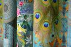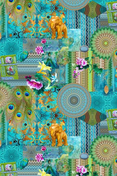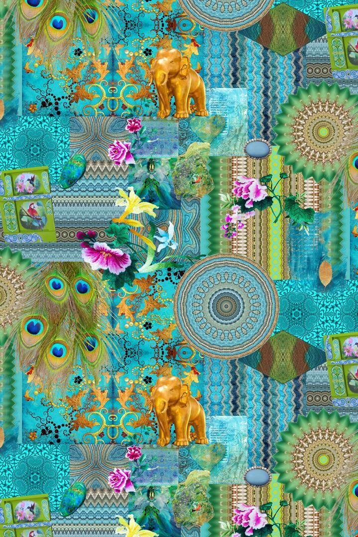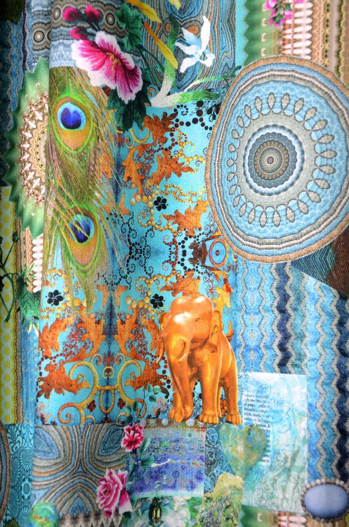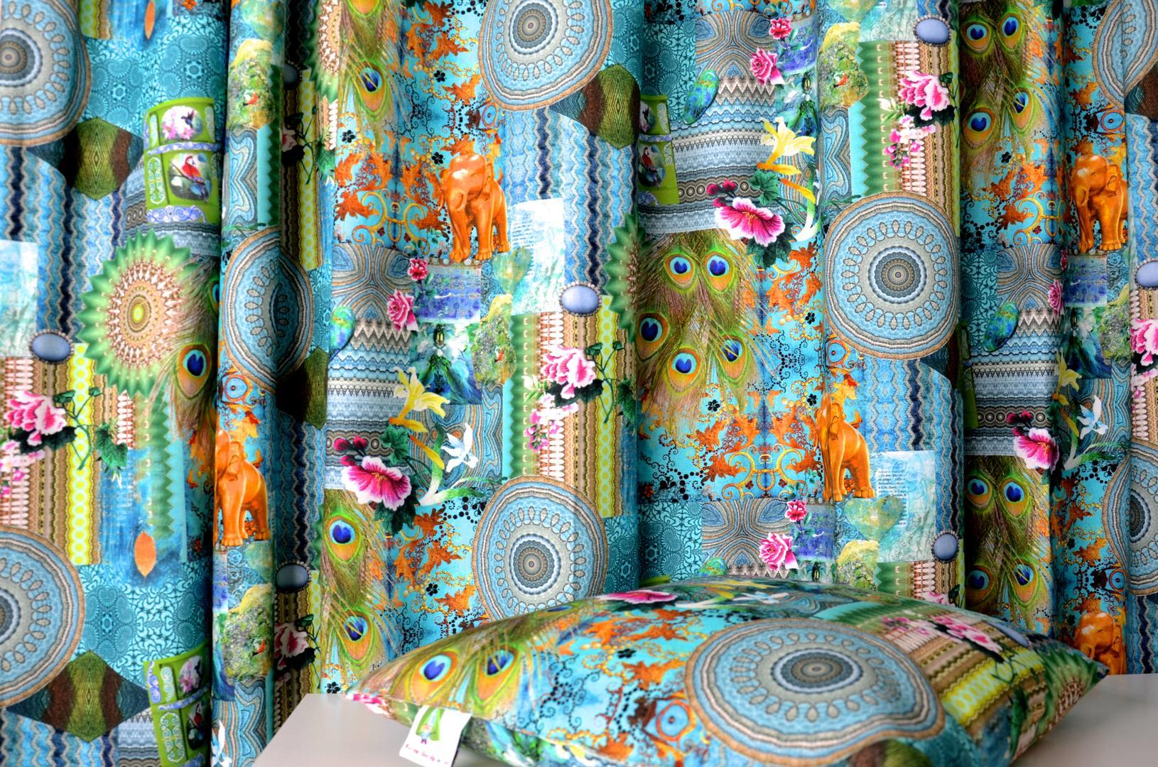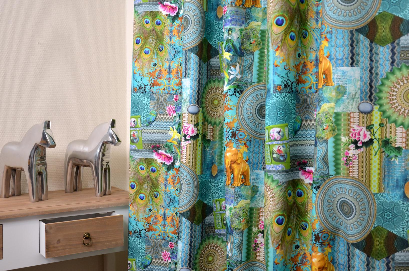 Exotisch gekleurd gordijn met een schitterende opdruk. Gouden olifanten tegen een azuurblauwe achtergrondkleur en felgekleurde pauwenveren tussen gekronkelde streep- en cirkelmotieven. Met deze gordijnen op de kinderkamer zullen uw (klein)kinderen niet snel uitgekeken raken.