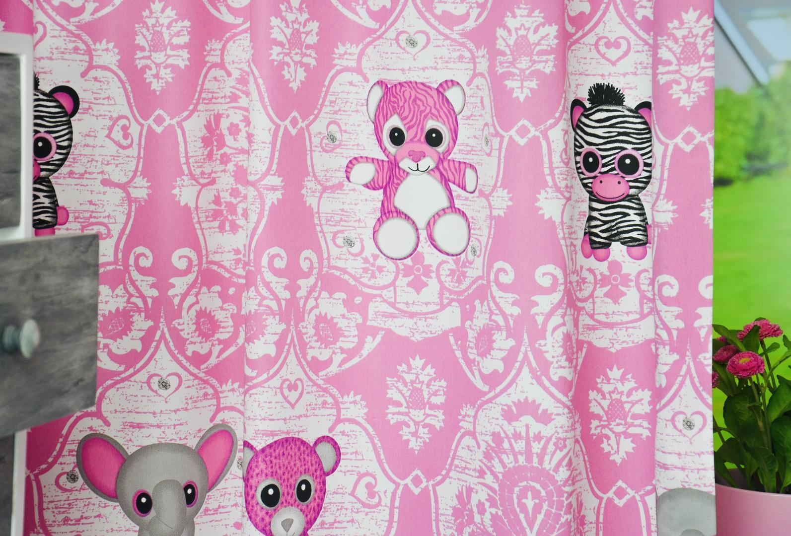 Schattige kraaloogjes kijken naar je vanaf dit gordijn. De troetelige diertjes zijn gedrukt op satijnzachte, soepelvallende stof. De roze ondergrondkleur is fraai poederig gekozen, waardoor het geheel extra lieflijk wordt! De knuffelbeer is maar liefst 15 cm groot en de ornamenten vorm om de dieren heen is zelfs 20 x 30 cm. Door dit royale patroon is dit gordijn heel geschikt voor grote raamoppervlaktes en confectie tot de grond. Mag Ollie Olifant met zijn twinkeloogjes bij jou komen wonen?