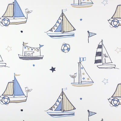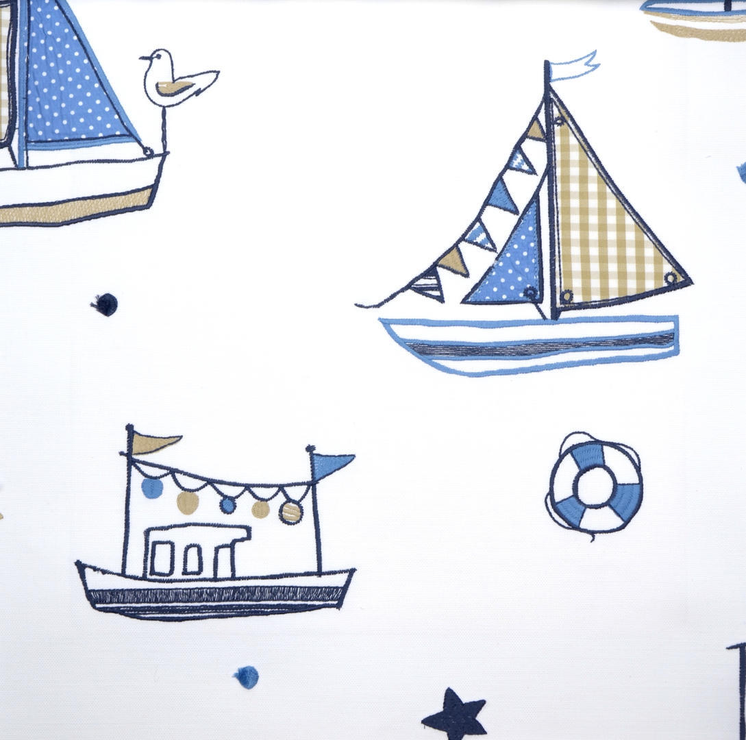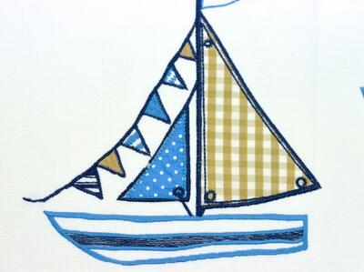 Dit is een bijzondere (nautische) gordijnstof, de scheepjes zijn er op geborduurd! Ook de zeilen zijn van echte opgestikte patchwork stof gemaakt. Dat geeft een prachtig reliëf aan deze ietwat ruw geweven katoen. Dat effect zorgt zeker voor een extra verfijnde finish aan jouw slaapkamer! Het bootje is zo’n 18 cm groot en zeilt zó jouw kamer in. “Sail away Captain!”