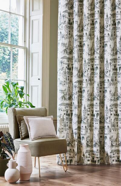 Dat geldt zeker ook voor deze gordijnstof met de naam Voyage, een unieke gordijnstof met een wereld en steden dessin.